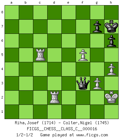 Last move : 1/2-1/2 2007 July 9 9:38:30 [Event "FICGS__CHESS__CLASS_C__000016"] [Site "FICGS"] [Date "2006.10.30"] [Round "1"] [White "Riha,Josef"] [Black "Colter,Nigel"] [Result "1/2-1/2"] [WhiteElo "1714"] [BlackElo "1745"] 1.e4 e6 2.d4 d5 3.Nc3 dxe4 4.Nxe4 Bd7 5.Nf3 Bc6 6.Bd3 Nd7 7.O-O Ngf6 8.Ned2 Be7 9.c4 O-O 10.b3 b6 11.Qc2 Bb7 12.Bb2 c5 13.Ne4 cxd4 14.Bxd4 Qc7 15.Rad1 Nxe4 16.Bxe4 Bxe4 17.Qxe4 Bf6 18.Rd2 Rad8 19.Rfd1 h6 20.g3 Bxd4 21.Qxd4 Nf6 22.Qxd8 Rxd8 23.Rxd8+ Kh7 24.R8d2 Qb7 25.Rd3 b5 26.Rc1 bxc4 27.Rxc4 Nd5 28.Ne5 Qa6 29.Nxf7 Qxa2 30.Kg2 Qe2 31.Rf3 Nf6 32.Re3 Qd1 33.Ne5 Nd5 34.Rf3 Qe2 35.Nd7 e5 36.Nc5 Nf6 37.h3 Qd2 38.Rd3 Qe2 39.Re3 Qb2 40.Ne6 e4 41.Nc5 a5 42.Nxe4 Nd5 43.Rd3 Qe5 44.h4 Nb4 45.Rd2 Nd5 46.Kg1 Kg6 47.f4 Qa1+ 48.Kf2 Nf6 49.Nxf6 Qxf6 50.Rc5 Qb6 51.R2d5 Qxb3 52.Rxa5 Qc2+ 53.Kg1 Qc1+ 54.Kg2 Qc2+ 55.Kh3 Qc8+ 56.f5+ Kh7 57.Ra2 Qc4 58.Rad2 Qf1+ 59.Kh2 Qa1 60.Rc2 Qa8 61.Re5 Qf3 62.Rd2 Qf1 63.Rc5 Qf3 1/2-1/2 French : Fort Knox variation Kingside Castling by player White (move 7) Kingside Castling by player Black (move 9) 10 pieces endgame at move 52 : White KRRPPP , Black KQPP WHITE : King + 2 Rooks 3 Pawns BLACK : King + 1 Queen 2 Pawns This chess game ended in a draw. Follow this game move after move (download)The game of chess is the touchstone of the intellect. (Goethe) Wenn Spassky eine Figur opfert kannst du genauso gut aufgeben. Aber wenn Tal eine Figur opfert, spiel weiter. Er könnte noch eine weitere opfern, und dann ... wer weiß? (Miguel Najdorf) Debemos de asegurarnos de que el Ajedrez no se convierta en un lenguaje muerto, muy interesante, pero solo para un grupo muy pequeño. (Sytze Faber) Les échecs sont utiles à l'exercice de la faculté de penser et à celle de l'imagination. Car nous devons posséder une méthode élaborée pour atteindre des buts partout où nous devons conduire notre raison. (Leibnitz) The various flowers seem good to different people. (Chinese proverb)