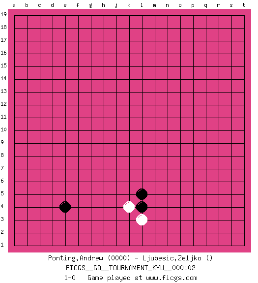 Last move : 1-0 2010 May 28 8:39:56 [Event "FICGS__GO__TOURNAMENT_KYU__000102"] [Site "FICGS"] [Date "2010.04.18"] [Round "1"] [Black "Ponting,Andrew"] [White "Ljubesic,Zeljko"] [Result "1-0"] [Rating 1 "0000"] 1.e4 k4 2.l4 l3 3.l5 1-0 This go game has been lost on time (started : 2010.04.18 0:27:18) Here are the names of the openings (joseki) played in the four corners : Corner q4 : l4 l3 This joseki is unknown. A weak or weird move has probably been played in this corner. Player Black won this Go (weiqi, baduk) game. Follow this game move after move (download)Grab the border points between two moyos. (Anonymous) If you are good, you will be assigned all the work. If you are really good, you will get out of it. (Dan Rotaru)