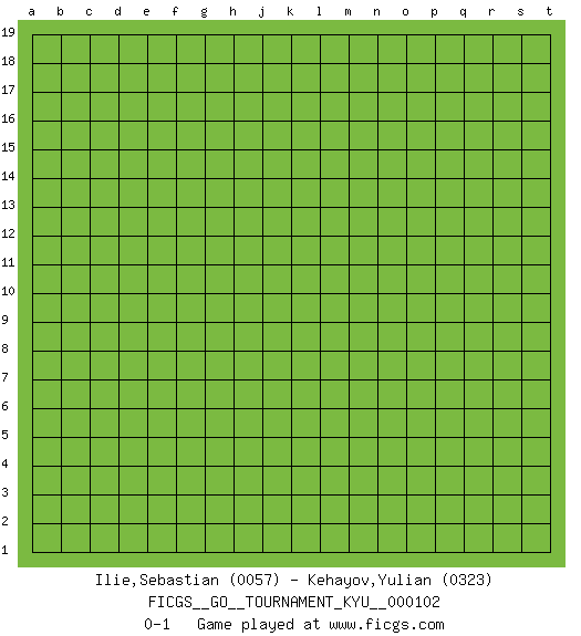 Last move : 0-1 2010 May 20 20:25:55 [Event "FICGS__GO__TOURNAMENT_KYU__000102"] [Site "FICGS"] [Date "2010.04.18"] [Round "1"] [Black "Ilie,Sebastian"] [White "Kehayov,Yulian"] [Result "0-1"] [Rating 1 "0057"] [Rating 2 "0323"] 0-1 This go game has been lost on time (started : 2010.04.18 0:27:18) Here are the names of the openings (joseki) played in the four corners : Player White won this Go (weiqi, baduk) game. Follow this game move after move (download)The nature of a game comes from what is played, but it's the sensitivity to the possible and the impossible that gives it value. (Pierre Audouard) Waiting for chance ? Play in casinos. (FICGS proverb)