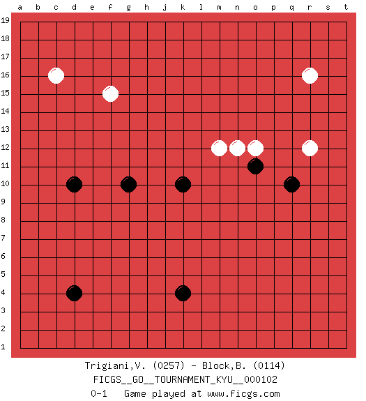 Last move : 0-1 2010 June 2 8:56:47 [Event "FICGS__GO__TOURNAMENT_KYU__000102"] [Site "FICGS"] [Date "2010.04.18"] [Round "1"] [Black "Trigiani,Vincenzo"] [White "Block,Benjamin"] [Result "0-1"] [Rating 1 "0257"] [Rating 2 "0114"] 1.k10 r16 2.d4 r12 3.k4 c16 4.d10 f15 5.g10 m12 6.q10 o12 7.o11 n12 0-1 This go game has been lost on time (started : 2010.04.18 0:27:18) Here are the names of the openings (joseki) played in the four corners : Player White won this Go (weiqi, baduk) game. Follow this game move after move (download)If you cannot succeed, then die gloriously. (Chinese proverb) When you've done things right people won't know you've done anything at all. (Futurama)