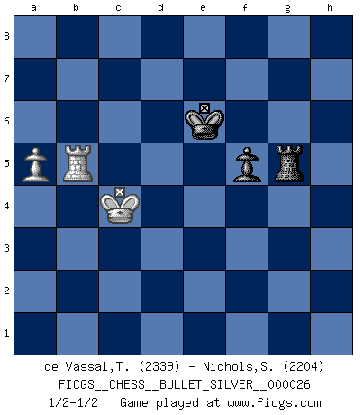 Last move : 1/2-1/2 2010 April 19 23:27:41 [Event "FICGS__CHESS__BULLET_SILVER__000026"] [Site "FICGS"] [Date "2010.04.19"] [Round "1"] [White "de Vassal,Thibault"] [Black "Nichols,Scott"] [Result "1/2-1/2"] [WhiteElo "2339"] [BlackElo "2204"] 1.e4 c5 2.Nf3 d6 3.d4 cxd4 4.Nxd4 Nf6 5.Nc3 a6 6.Be3 e5 7.Nb3 Be6 8.f3 Nbd7 9.g4 b5 10.g5 b4 11.Nd5 Nxd5 12.exd5 Bf5 13.h4 g6 14.Bd3 h6 15.Bxf5 gxf5 16.Qe2 Qb8 17.Nd4 exd4 18.Bxd4 Ne5 19.f4 Qb5 20.fxe5 Bg7 21.Rh2 Kf8 22.O-O-O hxg5 23.hxg5 Rxh2 24.Qxh2 Qxd5 25.exd6 Bxd4 26.Qd2 Bxb2+ 27.Kxb2 Qxd2 28.Rxd2 Ke8 29.Kb3 Rb8 30.d7+ Kd8 31.Rd6 Rb5 32.Rxa6 Kxd7 33.Rf6 Ke7 34.Ka4 Rc5 35.Kxb4 Rxc2 36.a4 Rb2+ 37.Ka3 Rg2 38.Rxf5 Ke6 39.Rb5 Rg3+ 40.Kb4 Rg4+ 41.Kb3 f5 42.a5 Rxg5 43.Kc4 1/2-1/2 Sicilian : Najdorf, Byrne (English) attack Queenside Castling by player White (move 22) 10 pieces endgame at move 32 : White KRPPP , Black KRPPP WHITE : King + 1 Rook 3 Pawns BLACK : King + 1 Rook 3 Pawns 9 pieces endgame at move 35 : White KRPPP , Black KRPP WHITE : King + 1 Rook 3 Pawns BLACK : King + 1 Rook 2 Pawns 8 pieces endgame at move 35 : White KRPP , Black KRPP WHITE : King + 1 Rook 2 Pawns BLACK : King + 1 Rook 2 Pawns 7 pieces endgame at move 38 : White KRPP , Black KRP WHITE : King + 1 Rook 2 Pawns BLACK : King + 1 Rook 1 Pawn 6 pieces endgame at move 42 : White KRP , Black KRP WHITE : King + 1 Rook 1 Pawn BLACK : King + 1 Rook 1 Pawn This chess game ended in a draw. Follow this game move after move (download)Bobby is the most misunderstood, misquoted celebrity walking the face of this earth. (Yasser Seirawan) Ich kämpfe solange mein Gegner einen Fehler machen kann. (Emanuel Lasker) El Ajedrez es el gimnasio de la mente. (Blaise Pascal) Assurément je connaissais par expérience le mystérieux attrait de ce jeu royal, le seul entre tous les jeux inventés par les hommes qui échappe souverainement à la tyrannie du hasard, le seul où l'on ne doive sa victoire qu'à son intelligence ou plutôt à une certaine forme d'intelligence. Mais n'est-ce pas déjà le limiter injurieusement que d'appeler les échecs un jeu ? N'est-ce pas une science, un art ou quelque chose qui, comme le cercueil de Mahomet entre ciel et terre, est suspendu entre l'un et l'autre, et qui réunit un nombre incroyable de contraires ? [...] C'est une pensée qui ne mène à rien, une mathématique qui n'établit rien, un art qui ne laisse pas d'uvre, une architecture sans matière; et il l'a prouvé néanmoins qu'il était plus durable, à sa manière, que les livres ou que tout autre monument, ce jeu unique qui appartient à tous les peuples et à tous les temps, et dont personne ne sait quel dieu en fit don à la terre pour tuer l'ennui, pour aiguiser l'esprit et stimuler l'âme. Où commence-t-il, où finit-il ? (Stefan Zweig) The message for business people contemplating their place in the cyberspace is simple and direct: get linked or get lost. (Vic Sussman and Kenan Pollack)