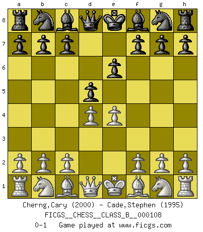 Last move : 0-1 2010 June 3 8:56:29 [Event "FICGS__CHESS__CLASS_B__000108"] [Site "FICGS"] [Date "2010.04.20"] [Round "1"] [White "Cherng,Cary"] [Black "Cade,Stephen"] [Result "0-1"] [WhiteElo "2000"] [BlackElo "1995"] 1.e4 e6 2.d4 d5 0-1 This chess game has been lost on time (started : 2010.04.20 13:42:20) French defense Player Black won this chess game. Follow this game move after move (download)Chess is in its essence a game, in its form an art, and in its execution a science. (Baron Tassilo) Gewinnen beim Schach fördert das Selbstvertrauen. Beim Sex spüre ich sowas nicht... (Garry Kasparov) Muchos se han convertido en Maestros de Ajedrez, nadie se ha convertido en el Maestro del Ajedrez. (Siegbert Tarrasch) Je fais ceci parce que dans cinquante coups j'obtiendrai cela; je m'appelle Mikhail Moisevitch Botvinnik. (Botvinnik) Happy endings are just stories that haven't finished yet. (Jane Smith in Mr & Mrs Smith)