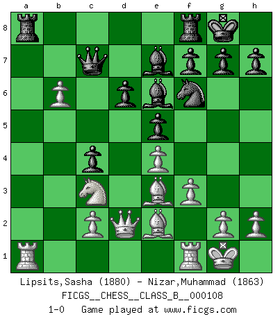 Last move : 1-0 2010 July 22 9:40:4 [Event "FICGS__CHESS__CLASS_B__000108"] [Site "FICGS"] [Date "2010.04.20"] [Round "1"] [White "Lipsits,Sasha"] [Black "Nizar,Muhammad"] [Result "1-0"] [WhiteElo "1880"] [BlackElo "1863"] 1.e4 c5 2.Nf3 d6 3.d4 cxd4 4.Nxd4 Nf6 5.Nc3 a6 6.f3 e5 7.Nb3 Be6 8.Be3 Nbd7 9.Qd2 b5 10.Bd3 Nb6 11.Na5 Qc7 12.a4 Nc4 13.Nxc4 bxc4 14.Be2 Rb8 15.O-O Be7 16.b4 O-O 17.b5 axb5 18.axb5 Ra8 19.b6 1-0 This chess game has been lost on time (started : 2010.04.20 13:42:20) Sicilian : Najdorf Kingside Castling by player White (move 15) Kingside Castling by player Black (move 16) Player White won this chess game. Follow this game move after move (download)By this measure (on the gap between Fischer & his contemporaries), I consider him the greatest world champion. (Garry Kasparov) Mein Name ist Rustam Kamsky. Sie haben meinen Sohn belästigt. Bereiten Sie sich aufs Sterben vor. (Rustam Kamsky) La batalla por la última verdad nunca sera ganada. Y es por eso que el Ajedrez es tan fascinante. (Hans Kmoch) Je crois qu'il existe des manières très spécifiques de jouer efficacement contre une machine. Evidemment, nous n'avons aucune chance en technique pure, parce que l'ordinateur calcule de manière parfaite. Mais lorsque nous faisons appel à notre cerveau, en utilisant l'intuition et la compréhension, alors nous restons beaucoup plus forts. (Anatoli Karpov) A good teacher is like a candle - it consumes itself to light the way for others. (Author unknown)