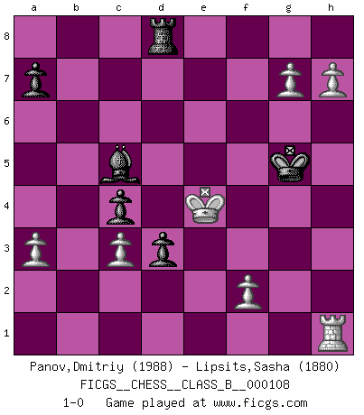 Last move : 1-0 2010 June 5 14:14:25 [Event "FICGS__CHESS__CLASS_B__000108"] [Site "FICGS"] [Date "2010.04.20"] [Round "1"] [White "Panov,Dmitriy"] [Black "Lipsits,Sasha"] [Result "1-0"] [WhiteElo "1988"] [BlackElo "1880"] 1.e4 e6 2.d4 d5 3.e5 c5 4.c3 Nc6 5.Nf3 Qb6 6.a3 c4 7.Nbd2 Na5 8.Be2 Bd7 9.O-O Ne7 10.Qc2 Ng6 11.g3 f6 12.exf6 gxf6 13.Re1 Rg8 14.Rb1 O-O-O 15.b3 cxb3 16.Nxb3 Ba4 17.Nfd2 Qc6 18.Nxa5 Bxc2 19.Nxc6 bxc6 20.Ba6+ Kd7 21.Rb7+ Kd6 22.Rxh7 Rd7 23.Rxd7+ Kxd7 24.Kf1 Nh8 25.h4 Nf7 26.Ke2 e5 27.Bd3 Bxd3+ 28.Kxd3 c5 29.Ke2 Bd6 30.dxe5 Nxe5 31.Rd1 Ke6 32.Nf3 Rh8 33.Nxe5 fxe5 34.Rh1 c4 35.h5 d4 36.h6 Bc5 37.g4 d3+ 38.Kf3 Kd5 39.g5 Ke6 40.g6 Kf6 41.g7 Rd8 42.Bg5+ Kxg5 43.h7 e4+ 44.Kxe4 1-0 French : Advance, Paulsen attack Kingside Castling by player White (move 9) Queenside Castling by player Black (move 14) Player White won this chess game. Follow this game move after move (download)The defensive power of a pinned piece is only imaginary. (Aaron Nimzovich) Der Schachmeister von Heute braucht Courage, einen Killerinstinkt, Ausdauer und Arroganz. (Larry Evans) Ciertamente, de todas la drogas del mundo, el Ajedrez debe ser el mas placentero permamentemente. (Assiac) Je ne suis pas le dernier à jouer lâchement des coups douteux pendant le zeïtnot de l'adversaire pour l'achever: en effet les coups qui font le plus peur sont ceux que l'on ne comprend pas. Je me fais souvent peur quand je joue. (Un professeur anonyme) I don't believe in psychology. I believe in good moves. (Bobby Fischer)