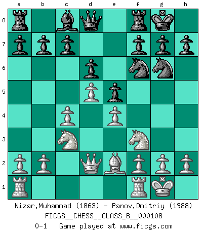 Last move : 0-1 2010 July 13 21:27:31 [Event "FICGS__CHESS__CLASS_B__000108"] [Site "FICGS"] [Date "2010.04.20"] [Round "1"] [White "Nizar,Muhammad"] [Black "Panov,Dmitriy"] [Result "0-1"] [WhiteElo "1863"] [BlackElo "1988"] 1.d4 Nf6 2.c4 e6 3.Nf3 Bb4+ 4.Bd2 Bxd2+ 5.Qxd2 O-O 6.Nc3 d6 7.e4 Nc6 8.Be2 e5 9.d5 Ne7 10.O-O Ng6 0-1 This chess game has been lost on time (started : 2010.04.20 13:42:20) Bogo-Indian defense Kingside Castling by player Black (move 5) Kingside Castling by player White (move 10) Player Black won this chess game. Follow this game move after move (download)I like the moment when I break a man's ego. (Bobby Fischer) Unter Putin wird alles Geld aus Russland wie von einem Staubsauger nach Moskau umgeleitet, das ist wie ein schwarzes Loch. (Garry Kasparov) Cuando tengas duda... ¡juega al Ajedrez!. (Tevis) Avec des compensations pour le matériel en plus... (Anonyme) Being number two sucks. (Andre Agassi)