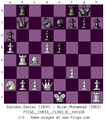 Last move : 1-0 2010 July 23 9:38:46 [Event "FICGS__CHESS__CLASS_B__000108"] [Site "FICGS"] [Date "2010.04.20"] [Round "1"] [White "Saindon,Daniel"] [Black "Nizar,Muhammad"] [Result "1-0"] [WhiteElo "1800"] [BlackElo "1863"] 1.e4 c5 2.Nf3 d6 3.d4 cxd4 4.Nxd4 Nf6 5.Nc3 a6 6.Be3 e5 7.Nb3 Be6 8.f3 Nbd7 9.Qd2 b5 10.a4 b4 11.Nd5 Bxd5 12.exd5 Nb6 13.Bxb6 Qxb6 14.a5 Qb7 15.Bc4 Be7 16.Ra4 Rb8 17.Nc1 O-O 18.Na2 Nd7 19.Rxb4 1-0 This chess game has been lost on time (started : 2010.04.20 13:42:20) Sicilian : Najdorf, Byrne (English) attack Kingside Castling by player Black (move 17) Player White won this chess game. Follow this game move after move (download)All I want to do, ever, is just play Chess. (Bobby Fischer) Man wirke der falschen Auffassung entgegen, als ob jeder Zug Unmittelbares zu leisten habe; auch Werte- und Ruhezüge haben ihre Existenzberechtigung. (Aaron Nimzowitsch) En el Ajedrez, cuando menos, el valiente hereda la tierra. (Edmar Mednis) Roi des jeux et jeu des rois, les échecs portent en eux un sentiment d'infini. Ils donnent à celui qui s'est efforcé d'en approfondir les arcanes l'impression de n'être pas à la mesure de l'homme; en fait, ils constituent un résumé de l'univers, un microcosme, et figurent cette grande échelle qui, dans les plans de la lumière descend jusqu'à la matière, qui des abîmes insondables remonte jusqu'en l'infini de Dieu. (Pyrame) There are two kinds of tragedy in this world, one is not getting what you want and the other is getting. (Lord of war)