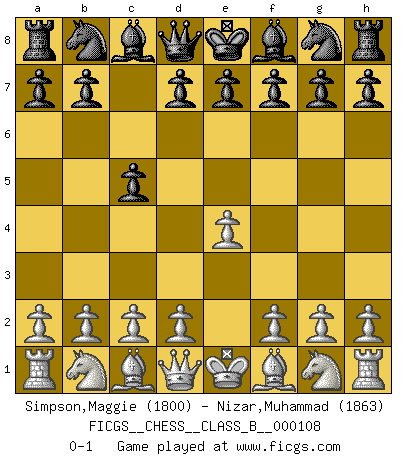 Last move : 0-1 2010 July 5 21:21:21 [Event "FICGS__CHESS__CLASS_B__000108"] [Site "FICGS"] [Date "2010.04.20"] [Round "1"] [White "Simpson,Maggie"] [Black "Nizar,Muhammad"] [Result "0-1"] [WhiteElo "1800"] [BlackElo "1863"] 1.e4 c5 0-1 This chess game has been lost on time (started : 2010.04.20 13:42:20) Sicilian defense Player Black won this chess game. Follow this game move after move (download)The enormous mental resilience, without which no Chess player can exist, was so much taken up by Chess that he could never free his mind of this game. (Albert Einstein) Kostenjuk hat keinen Sexappeal. (Loek van Wely) Hasta este punto, las blancas han seguido un análisis bien conocido. Pero ahora el hace un error fatal: empieza a usar su propia cabeza. (Siegbert Tarrasch) La conception d'un plan est le processus par lequel un joueur exploite les avantages de sa position tout en s'efforçant d'en réduire au minimum les inconvénients. Afin de garantir le succès, un plan doit toujours se fonder sur un diagnostic objectif des particularités d'une position. La conception d'un plan est d'autant plus difficile que la position est équilibrée, et grandement facilitée lorsqu'il n'existe qu'un seul plan susceptible de répondre aux exigences de la position. (Harry Golombek) There are two major products that came out of Berkeley: LSD and UNIX. We do not believe this is to be a coincidence. (Jeremy S. Anderson)