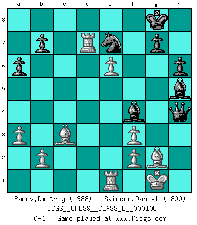 Last move : 0-1 2010 October 7 21:26:39 [Event "FICGS__CHESS__CLASS_B__000108"] [Site "FICGS"] [Date "2010.04.20"] [Round "1"] [White "Panov,Dmitriy"] [Black "Saindon,Daniel"] [Result "0-1"] [WhiteElo "1988"] [BlackElo "1800"] 1.e4 c5 2.c3 Nf6 3.e5 Nd5 4.d4 cxd4 5.cxd4 d6 6.Nf3 Nc6 7.Bc4 e6 8.O-O Be7 9.Qe2 O-O 10.Qe4 Bd7 11.Bd3 f5 12.exf6 Nxf6 13.Qe2 Qa5 14.Nc3 Qh5 15.Re1 Rae8 16.h3 Nd5 17.Be4 Kh8 18.Bd2 Nxc3 19.Bxc3 d5 20.Bc2 Bd6 21.a3 Re7 22.Rad1 a6 23.Rd3 Be8 24.Re3 Rf6 25.Bd2 h6 26.Qf1 Kg8 27.Bc3 Bf4 28.R3e2 Bc7 29.Bb1 Bb8 30.Rd2 Rxf3 31.gxf3 Qh4 32.Bd3 Bf4 33.R2d1 Bd7 34.Qg2 e5 35.Bf1 Bf5 36.dxe5 Re6 37.Rxd5 Rg6 38.Qxg6 Bxg6 39.e6 Ne7 40.Rd7 Bh5 41.Bg2 Qg5 42.h4 Qxh4 0-1 Sicilian : Alapin's variation (2.c3) Kingside Castling by player White (move 8) Kingside Castling by player Black (move 9) Player Black won this chess game. Follow this game move after move (download)In blitz, the Knight is stronger than the Bishop. (Vlastimil Hort) Ich glaube nicht an Psychologie, ich glaube an gute Züge. (Robert James Fischer) Fischer deseaba darle a los Rusos una sopa de su propia medicina. (Larry Evans) Il s'avisa de me proposer d'apprendre les échecs qu'il jouait un peu... me voilà forcené des échecs. J'achète un échiquier, je m'enferme dans ma chambre, j'y passe des jours et des nuits à vouloir apprendre par cur toutes les parties. (Jean-Jacques Rousseau, Confessions) The only difference between a tax man and a taxidermist is that the taxidermist leaves the skin. (Mark Twain)