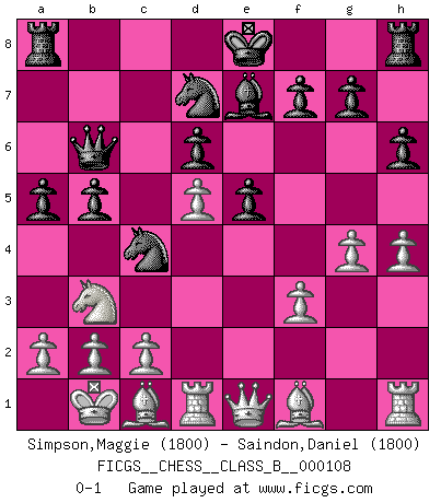 Last move : 0-1 2010 July 8 21:18:37 [Event "FICGS__CHESS__CLASS_B__000108"] [Site "FICGS"] [Date "2010.04.20"] [Round "1"] [White "Simpson,Maggie"] [Black "Saindon,Daniel"] [Result "0-1"] [WhiteElo "1800"] [BlackElo "1800"] 1.e4 c5 2.Nf3 d6 3.d4 cxd4 4.Nxd4 Nf6 5.Nc3 a6 6.Be3 e5 7.Nb3 Be6 8.f3 Be7 9.Qd2 Nbd7 10.g4 h6 11.O-O-O b5 12.h4 Nb6 13.Qf2 Nfd7 14.Kb1 Qc7 15.Nd5 Bxd5 16.exd5 Nc4 17.Bc1 Qb6 18.Qe1 a5 0-1 Sicilian : Najdorf, Byrne (English) attack Queenside Castling by player White (move 11) Player Black won this chess game. Follow this game move after move (download)We cannot resist the fascination of sacrifice, since a passion for sacrifices is part of a Chessplayer's nature. (Rudolf Spielman) Ich tröste mich mit dem Vergnügen, daß Schachfans, Zuschauer und Leser glücklich sind, wenn ein Großmeister etwas riskiert, statt nur Klötzchen zu schieben. (Mikhail Nekhemyevich Tal) Un jugador que trata de regresar una movida en el Ajedrez es un futuro carterista. (Richard Fenton) Le pion, dans sa simplicité, marche droit devant lui, mais lorsqu'il prend, il le fait obliquement? Ainsi l'homme, tant qu'il reste pauvre, marche dans la droiture et vit honnêtement, mais lorsqu'il recherche les honneurs, il flatte, se parjure et, par les voies obliques, cherche une position supérieure sur l'échiquier du monde. (Jean de Galles) I'm extremely disappointed. I send you out for exciting, new designer drugs, you come back with tomato sauce. (Gregory House, House M.D.)