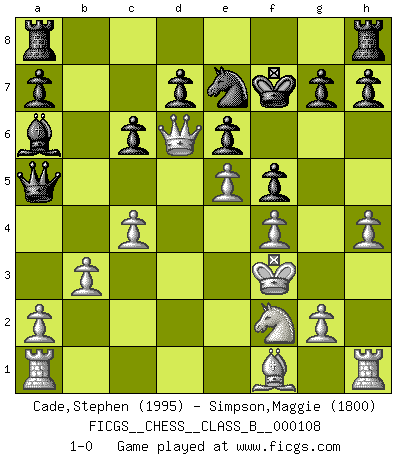 Last move : 1-0 2010 July 9 9:20:39 [Event "FICGS__CHESS__CLASS_B__000108"] [Site "FICGS"] [Date "2010.04.20"] [Round "1"] [White "Cade,Stephen"] [Black "Simpson,Maggie"] [Result "1-0"] [WhiteElo "1995"] [BlackElo "1800"] 1.e4 c5 2.Nc3 e6 3.Nf3 Nc6 4.d4 cxd4 5.Nxd4 Nf6 6.Nxc6 bxc6 7.e5 Nd5 8.Ne4 Qc7 9.f4 Qb6 10.c4 Bb4+ 11.Ke2 f5 12.Nf2 Ba6 13.Kf3 Ne7 14.Be3 Bc5 15.Bxc5 Qxc5 16.Qd6 Qa5 17.h4 Kf7 18.b3 1-0 Sicilian : Closed Player White won this chess game. Follow this game move after move (download)It is no time to be playing Chess when the house is on fire. (Italian Proverb) Charakterschwächen offenbaren sich normalerweise während einer Schachpartie. (Garry Kasparov) Aún el Rey más flojo huye despavorido ante la amenaza de un Jaque doble. (Aaron Nimzowitsch) Ce qui caractérise les parties de combat, c'est que si le défenseur a constamment de difficiles problèmes à résoudre, l'attaquant doit chercher sans relâche de nouvelles possibilités d'attaque. (Koblentz) The faster the computer, the slower the brain. (Thibault de Vassal)