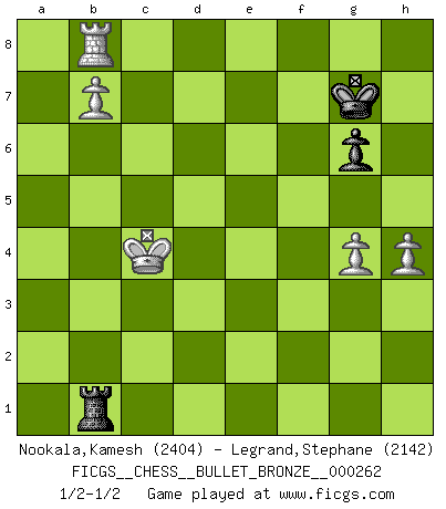 Last move : 1/2-1/2 2010 April 28 18:56:53 [Event "FICGS__CHESS__BULLET_BRONZE__000262"] [Site "FICGS"] [Date "2010.04.28"] [Round "1"] [White "Nookala,Kamesh"] [Black "Legrand,Stephane"] [Result "1/2-1/2"] [WhiteElo "2404"] [BlackElo "2142"] 1.e4 e5 2.Nf3 Nc6 3.Bb5 f5 4.Nc3 Nf6 5.exf5 Nd4 6.Nxe5 c6 7.Bd3 d6 8.Nf3 Qe7+ 9.Kf1 Nxf5 10.h3 g6 11.Qe2 Bg7 12.b3 Qxe2+ 13.Bxe2 Ne4 14.Bb2 O-O 15.Re1 Nxd2+ 16.Nxd2 Ng3+ 17.Kg1 Nxh1 18.Kxh1 d5 19.Nd1 Bxb2 20.Nxb2 Bf5 21.c3 Rae8 22.Kg1 c5 23.Nf1 Bb1 24.a3 b6 25.Ne3 Ba2 26.b4 Kg7 27.Bb5 Rc8 28.Nd3 d4 29.cxd4 cxd4 30.Ng4 Rc3 31.a4 Bd5 32.Nge5 Rf6 33.h4 h6 34.Kh2 Ra3 35.f3 a6 36.Bxa6 Rxa4 37.Bb5 Ra3 38.Kg3 Rd6 39.Bc4 Bb7 40.Nf7 Rd7 41.Nd6 Rxd6 42.Re7+ Kf8 43.Rxb7 Rc3 44.Ne5 d3 45.Bxd3 R6xd3 46.Nxd3 Rxd3 47.Rxb6 Kg7 48.Rb8 h5 49.b5 Rd2 50.b6 Rb2 51.b7 Rb4 52.Kf2 Rb2+ 53.Ke3 Kh7 54.Kf4 Kg7 55.g4 hxg4 56.fxg4 Rb4+ 57.Ke5 Rb6 58.Kd5 Rb1 59.Kc6 Rc1+ 60.Kb6 Rb1+ 61.Kc5 Rc1+ 62.Kd6 Rd1+ 63.Ke5 Re1+ 64.Kf4 Rf1+ 65.Ke4 Re1+ 66.Kd3 Rb1 67.Kc4 1/2-1/2 Ruy Lopez : Schliemann defense, Berger variation Kingside Castling by player Black (move 14) 10 pieces endgame at move 47 : White KRPPPP , Black KRPP WHITE : King + 1 Rook 4 Pawns BLACK : King + 1 Rook 2 Pawns 9 pieces endgame at move 55 : White KRPPP , Black KRPP WHITE : King + 1 Rook 3 Pawns BLACK : King + 1 Rook 2 Pawns 8 pieces endgame at move 56 : White KRPPP , Black KRP WHITE : King + 1 Rook 3 Pawns BLACK : King + 1 Rook 1 Pawn This chess game ended in a draw. Follow this game move after move (download)Nowadays, when you're not a grandmaster at 14, you can forget about it. (Anand Viswanathan) Ich erzeugte keinen Neid, da mich die Schachspieler als Musiker und die Musiker als Schachspieler betrachteten. (Mark Taimanov) Nunca antes ha habido un jugador de Ajedrez con tal conocimiento a fondo de las complejidades del juego y una inmensa voluntad absolutamente indomable de ganar. Yo pienso que Fischer es el jugador mas grande que jamás haya existido. (Lisa Lane) Même un GMI sait rarement calculer sur plus de cinq coups une attaque à sacrifices. (Rudolf Spielmann) Patience, use the Force, think ! (Obi-Wan Kenobi in Star Wars ep.2)