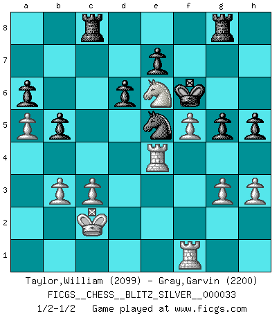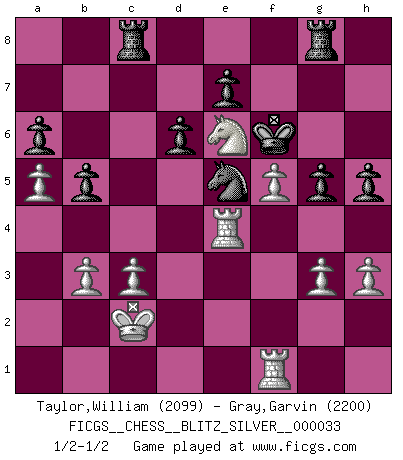 Last move : 1/2-1/2 2010 April 21 14:55:11 [Event "FICGS__CHESS__BLITZ_SILVER__000033"] [Site "FICGS"] [Date "2010.04.21"] [Round "1"] [White "Taylor,William"] [Black "Gray,Garvin"] [Result "1/2-1/2"] [WhiteElo "2099"] [BlackElo "2200"] 1.e4 d6 2.d4 Nf6 3.Nc3 g6 4.f4 Bg7 5.Nf3 c5 6.Bb5+ Bd7 7.e5 Ng4 8.e6 Bxb5 9.exf7+ Kd7 10.Nxb5 Qa5+ 11.Nc3 cxd4 12.Nxd4 Bxd4 13.Qxd4 Nc6 14.Qc4 Qb6 15.Qe2 h5 16.Bd2 Nd4 17.Qd3 Nf5 18.Ne4 Nge3 19.g3 Rac8 20.c3 Rhf8 21.Ng5 Qc6 22.Rg1 Qc4 23.Qxc4 Nxc4 24.b3 Nxd2 25.Kxd2 Nh6 26.Rae1 Nxf7 27.Ne6 Rg8 28.Re2 g5 29.f5 Ne5 30.Kc2 Ke8 31.h3 Kf7 32.a4 a6 33.Re4 b5 34.Rf1 Kf6 35.a5 1/2-1/2 Pirc : Austrian attack, Dragon formation This chess game ended in a draw. Follow this game move after move (download)Pawn endings are to Chess what putting is to golf. (Cecil Purdy) Lisa Lane, amerikanische Schachmeisterin, hatte Fischer einmal als stärksten lebenden Spieler bezeichnet. Antwort: Das ist richtig, aber Lisa Lane ist eigentlich nicht in der Lage, das zu beurteilen. (Robert James Fischer) El Rey es una pieza de pelea. ¡Usenlo!. (Wilhelm Steinitz) Psychologiquement, tu dois avoir confiance en toi même, mais cette confiance doit être basée sur des faits. (Robert Fischer) I don't know, I don't care, and it doesn't make any difference. (Albert Einstein)