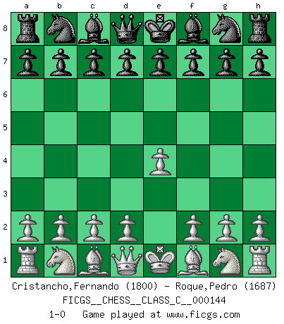 Last move : 1-0 2010 June 8 9:22:31 [Event "FICGS__CHESS__CLASS_C__000144"] [Site "FICGS"] [Date "2010.04.21"] [Round "1"] [White "Cristancho,Fernando"] [Black "Roque,Pedro"] [Result "1-0"] [WhiteElo "1800"] [BlackElo "1687"] 1.e4 1-0 This chess game has been lost on time (started : 2010.04.21 14:11:11) King's pawn Opening Player White won this chess game. Follow this game move after move (download)The older I grow, the more I value pawns. (Paul Keres) Bobby Fischer ist kein Vorbild für die heutige Jugend. (Viktor Kortschnoi) Robert Fischer es la ley hacia si mismo. (Larry Evans) Même si l'adversaire joue le coup analysé précédemment, recommencez l'analyse en voyant la nouvelle position. Première règle de Blumenfeld There are three kinds of lies: lies, damned lies and statistics. (Mark Twain)