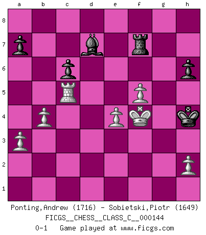 Last move : 0-1 2010 December 31 10:58:35 [Event "FICGS__CHESS__CLASS_C__000144"] [Site "FICGS"] [Date "2010.04.21"] [Round "1"] [White "Ponting,Andrew"] [Black "Sobietski,Piotr"] [Result "0-1"] [WhiteElo "1716"] [BlackElo "1649"] 1.c4 e5 2.g3 Nf6 3.Bg2 Nc6 4.Nc3 Bb4 5.Nd5 O-O 6.Nxb4 Nxb4 7.d3 Qe7 8.a3 Nc6 9.b4 Rd8 10.Bg5 h6 11.Bxf6 Qxf6 12.Nf3 d6 13.O-O Be6 14.Nd2 d5 15.Rc1 dxc4 16.Bxc6 bxc6 17.Nxc4 e4 18.Na5 exd3 19.exd3 Bd5 20.Re1 Re8 21.Re3 Re6 22.Rxe6 Qxe6 23.Nc4 Rd8 24.Qe1 f6 25.Qxe6+ Bxe6 26.Nb2 Bd5 27.f4 g5 28.Kf2 Kf7 29.Na4 Kg6 30.Nc3 gxf4 31.gxf4 Be6 32.Ke3 Re8 33.Ne4 f5 34.Rxc6 fxe4 35.dxe4 Kh5 36.Kf3 Re7 37.Rc5+ Kh4 38.f5 Rf7 39.Ra5 c6 40.Kf4 Bc8 41.Rc5 Bd7 0-1 This chess game has been lost on time (started : 2010.04.21 14:11:11) English Opening Kingside Castling by player Black (move 5) Kingside Castling by player White (move 13) Player Black won this chess game. Follow this game move after move (download)Chess is not like life... it has rules ! (Mark Pasternak) Wie, soll nun auch die Opposition abgeschafft werden? Ja, es tut mir leid, Ihnen diesen Schmerz nicht ersparen zu können. (Aaron Nimzowitsch) No hay precio que sea tan grande por la cabellera del Rey enemigo. (Koblentz) Le moment que je préfère le plus dans une rencontre, c'est celui où je sens que la personnalité de l'adversaire se brise. (Robert Fischer) Be who you are, and say what you feel because those who mind don't matter, and those who matter don't mind. (Dr Seuss)