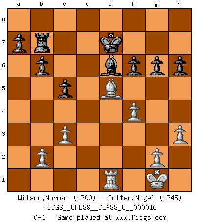Last move : 0-1 2007 April 18 8:33:42 [Event "FICGS__CHESS__CLASS_C__000016"] [Site "FICGS"] [Date "2006.10.30"] [Round "1"] [White "Wilson,Norman"] [Black "Colter,Nigel"] [Result "0-1"] [WhiteElo "1700"] [BlackElo "1745"] 1.e4 e6 2.d4 d5 3.Nc3 dxe4 4.Nxe4 Bd7 5.c3 Bc6 6.Ng3 Nd7 7.Nf3 Ngf6 8.Bd2 Bd6 9.Bd3 b6 10.O-O O-O 11.Qe2 e5 12.Nxe5 Bxe5 13.dxe5 Nxe5 14.Qxe5 Qxd3 15.Rad1 Rfe8 16.Qf5 Qxf5 17.Nxf5 Bb5 18.Rfe1 Be2 19.Rc1 Bd3 20.Ne7+ Kf8 21.Nc6 Be4 22.Nd4 c5 23.Nb5 Bc6 24.Nc7 Rxe1+ 25.Rxe1 Rd8 26.Bc1 h6 27.Bf4 Nd5 28.Nxd5 Bxd5 29.Bc7 Rd7 30.Rd1 Ke7 31.Bb8 Bxa2 32.Re1+ Be6 33.f4 g6 34.h3 Rb7 35.Be5 f6 0-1 French : Rubinstein variation Kingside Castling by player White (move 10) Kingside Castling by player Black (move 10) Player Black won this chess game. Follow this game move after move (download)A great player and a great example for many. His book My 60 Memorable Games had a big impact on me. It is a shame he didn't continue to enrich the world of chess with his unparalleled understanding after 1972. (Jan Timman, about Bobby Fischer's death) Warum muß ich gegen diesen IDIOTEN verlieren? (Aaron Nimzowitsch) El Ajedrez te enseña a controlarl la excitación inicial que sientes cuando vez algo que parece bueno y te enseña a pensar objetivamente cuando te encuentras en problemas. (Stanley Kubrick) Les échecs, c'est l'art d'analyser. (Mikhail Botvinnik) Live, lose, and learn, by observing your opponent how to win. (Amber Steenbock)