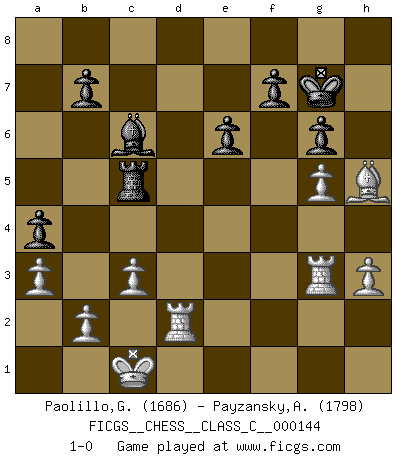 Last move : 1-0 2010 May 30 14:53:6 [Event "FICGS__CHESS__CLASS_C__000144"] [Site "FICGS"] [Date "2010.04.21"] [Round "1"] [White "Paolillo,Giampiero"] [Black "Payzansky,Aleksey"] [Result "1-0"] [WhiteElo "1686"] [BlackElo "1798"] 1.e4 c5 2.Nf3 d6 3.d4 cxd4 4.Nxd4 Nf6 5.Nc3 g6 6.Be3 Bg7 7.f3 O-O 8.Qd2 Nc6 9.g4 Nxd4 10.Bxd4 Be6 11.O-O-O Qa5 12.Kb1 Rfc8 13.a3 Rab8 14.Nd5 Qxd2 15.Nxf6+ Bxf6 16.Rxd2 Bxd4 17.Rxd4 Rc5 18.Be2 Rbc8 19.c3 h5 20.h3 Kg7 21.Kc1 Rh8 22.R4d1 Bb3 23.Rde1 d5 24.exd5 Bxd5 25.Bd1 e6 26.Rh2 hxg4 27.fxg4 Rh4 28.g5 Bc6 29.Rg1 a5 30.Rg3 a4 31.Rd2 Rh5 32.Bxh5 1-0 Sicilian : Dragon, Yugoslav attack, 7...O-O Kingside Castling by player Black (move 7) Queenside Castling by player White (move 11) Player White won this chess game. Follow this game move after move (download)Modern Chess is too much concerned with things like Pawn structure. Forget it, Checkmate ends the game. (Nigel Short) Ein bischen Romantik kann weder im Schach noch in der Liebe schaden. Also versuche ich mich ab und zu daran zu erinnern. (Nigel Short) Aquellos que dicen que entienden al Ajedrez, no entienden nada. (Robert Hubner) Les Echecs représentent une sphère d'idées créatrices basée sur la volonté des deux protagonistes. (Smyslov) The project of the man are lower than those of the sky. (Chinese proverb)