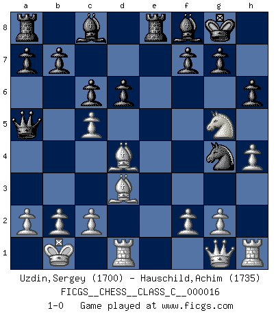 Last move : 1-0 2007 January 9 5:17:56 [Event "FICGS__CHESS__CLASS_C__000016"] [Site "FICGS"] [Date "2006.10.30"] [Round "1"] [White "Uzdin,Sergey"] [Black "Hauschild,Achim"] [Result "1-0"] [WhiteElo "1700"] [BlackElo "1735"] 1.e4 e5 2.Nf3 Nf6 3.Nxe5 d6 4.Nf3 Nxe4 5.Nc3 Nxc3 6.dxc3 Be7 7.Be3 O-O 8.Qd2 Na6 9.O-O-O c6 10.Kb1 Nc5 11.h4 Ne4 12.Qe1 Re8 13.Bd3 Bf8 14.Qg1 Nf6 15.c4 Qa5 16.Bd4 Ng4 17.Ng5 h6 18.c5 1-0 Petrov : Nimzovich attack Kingside Castling by player Black (move 7) Queenside Castling by player White (move 9) Player White won this chess game. Follow this game move after move (download)There is no remorse like the remorse of Chess. (H. G. Wells) Das Blackmar-Diemer-Gambit verändert den ganzen Menschen! (Emil Joseph Diemer) Evita las multitudes. Haz independientemente tu propio razonamiento. Trata de ser el jugador de Ajedrez, no la pieza de Ajedrez. (Ralph Charell) Toute estimation doit être constamment réévaluée. (Jacob Estrin) There is far too much law for those who can afford it and far too little for those who cannot. (Derek Bok)