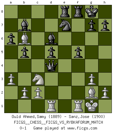 Last move : 0-1 2010 August 10 9:34:52 [Event "FICGS__CHESS__FICGS_VS_RYBKAFORUM_MATCH"] [Site "FICGS"] [Date "2010.04.22"] [Round "1"] [White "Ould Ahmed,Samy"] [Black "Sanz,Jose"] [Result "0-1"] [WhiteElo "1889"] [BlackElo "1900"] 1.e4 e6 2.d4 d5 3.Nc3 Nf6 4.e5 Nfd7 5.f4 c5 6.Nf3 Be7 7.Be3 O-O 8.Qd2 a6 9.Be2 Nc6 10.O-O b5 11.a3 Bb7 12.dxc5 Nxc5 13.Qe1 Qc7 14.Qf2 Nd7 15.Bd3 Na5 16.f5 exf5 17.Bxf5 Nc4 18.Bd4 Ncxe5 19.Nxe5 Nxe5 20.Rae1 Ng6 21.g3 Bd6 22.Bh3 Ne7 23.Bg2 Rae8 24.Rd1 f5 25.Bb6 Qc4 26.Qd4 Qxd4+ 0-1 This chess game has been lost on time (started : 2010.04.22 0:3:9) French : Steinitz variation Kingside Castling by player Black (move 7) Kingside Castling by player White (move 10) Player Black won this chess game. Follow this game move after move (download)I had a toothache during the first game. In the second game I had a headache. In the third game it was an attack of rheumatism. In the fourth game, I wasn't feeling well. And in the fifth game? Well, must one have to win every game ? (Siegbert Tarrasch) Über Karpov: Er war und ist ein Vertreter der russischen Reaktionäre. Das steckt tief in seiner Seele, wehalb ich nicht nett mit ihm umgehen kann. (Viktor Kortschnoi) ¿Se han dado cuenta de que Fischer casi nunca ha tenido piezas malas? El las intercambia y las piezas malas se quedan con sus oponenets. (Yuri Balashov) Il n'y a pas eu de défaite parce que je ne crois pas que cet ordinateur ait jamais existé. IBM a triché en refusant d'imprimer les modes de recherche de la machine. C'est évident, pendant le match, des coups décisifs ont été joués par des êtres humains. Aujourd'hui, les meilleurs spécialistes en informatique ne peuvent toujours pas expliquer comment Deep-Blue a pu jouer contre la logique des ordinateurs. IBM a gagné une guerre de communication, mais ils sont incapables de prouver que l'ordinateur a gagné tout seul. (Garry Kasparov) The Movers & Shakers of this world are those who play chess in the mornings and go to the disco in the evenings. (Dinesh De Silva)