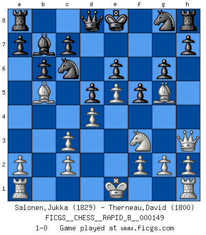 Last move : 1-0 2010 June 9 9:27:11 [Event "FICGS__CHESS__RAPID_B__000149"] [Site "FICGS"] [Date "2010.04.22"] [Round "1"] [White "Salonen,Jukka"] [Black "Therneau,David"] [Result "1-0"] [WhiteElo "1829"] [BlackElo "1800"] 1.e4 e6 2.d4 d5 3.Nc3 Bb4 4.e5 Bxc3+ 5.bxc3 Nc6 6.Qg4 g6 7.Nf3 f5 8.Qh3 b6 9.Bb5 Bb7 10.Bg5 1-0 This chess game has been lost on time (started : 2010.04.22 1:17:13) French : Winawer, Advance variation Player White won this chess game. Follow this game move after move (download)Chess is a foolish expedient for making idle people believe they are doing something very clever when they are only wasting their time. (George Bernard Shaw) Versuche, dich von der Sklaverei der Eröffnungsvarianten zu befreien. Stattdessen soll man gewisse Typenpositionen erlernen, die man eingehend analysiert. (Aaron Nimzowitsch) Yo jugué Ajedrez con el y a veces le pude haber ganado solo que siempre devuelve su última jugada y juega la partida de manera diferente. (Mark Twain) On est toujours la mazette de quelqu'un d'autre. (Anonyme) Luck is when opportunity knocks and you answer. (Anonymous)