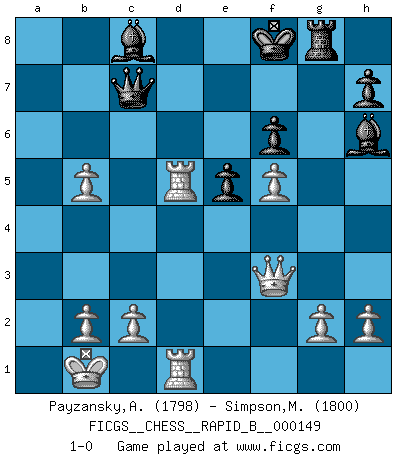 Last move : 1-0 2010 April 23 18:36:49 [Event "FICGS__CHESS__RAPID_B__000149"] [Site "FICGS"] [Date "2010.04.22"] [Round "1"] [White "Payzansky,Aleksey"] [Black "Simpson,Maggie"] [Result "1-0"] [WhiteElo "1798"] [BlackElo "1800"] 1.e4 c5 2.Nf3 d6 3.d4 cxd4 4.Nxd4 Nf6 5.Nc3 a6 6.Bg5 e6 7.f4 Qc7 8.Qf3 b5 9.Bxf6 gxf6 10.e5 d5 11.exf6 Nd7 12.O-O-O Nxf6 13.f5 e5 14.Nxd5 Nxd5 15.Qxd5 Bb7 16.Nxb5 Bh6+ 17.Kb1 axb5 18.Bxb5+ Kf8 19.Qb3 Bc8 20.Qf3 Rb8 21.a4 f6 22.Rd5 Rxb5 23.axb5 Rg8 24.Rhd1 1-0 Sicilian : Najdorf, 7.f4 Queenside Castling by player White (move 12) Player White won this chess game. Follow this game move after move (download)You sit at the board and suddenly your heart leaps. Your hand trembles to pick up the piece and move it. But what Chess teaches you is that you must sit there calmly and think about whether it's really a good idea and whether there are other better ideas. (Stanley Kubrick) Moralische Siege zählen nicht. (Savielly Grigorievitsch Tartakower) El Ajedrez es un cuento de Hadas de las 1001 metidas de pata. (Savielly Tartakower) Ce qui caractérise les parties de combat, c'est que si le défenseur a constamment de difficiles problèmes à résoudre, l'attaquant doit chercher sans relâche de nouvelles possibilités d'attaque. (Koblentz) Lamb in skin of tiger, still fears the wolf. (Chinese proverb)