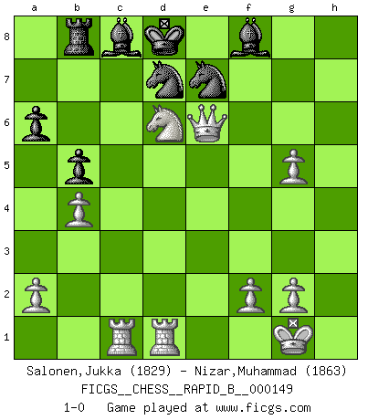 Last move : 1-0 2010 July 6 21:21:20 [Event "FICGS__CHESS__RAPID_B__000149"] [Site "FICGS"] [Date "2010.04.22"] [Round "1"] [White "Salonen,Jukka"] [Black "Nizar,Muhammad"] [Result "1-0"] [WhiteElo "1829"] [BlackElo "1863"] 1.e4 c5 2.Nf3 d6 3.d4 cxd4 4.Nxd4 Nf6 5.Nc3 a6 6.Bc4 e6 7.O-O Nbd7 8.Bg5 Be7 9.Bxe6 fxe6 10.Nxe6 Qa5 11.Nxg7+ Kf7 12.Nf5 Bf8 13.Nd5 Rg8 14.b4 Qb5 15.h4 Nxd5 16.c4 Qxc4 17.Rc1 Qxe4 18.Qh5+ Rg6 19.Qxh7+ Rg7 20.Nh6+ Ke8 21.Qxe4+ Ne7 22.Nf5 Rxg5 23.Nxd6+ Kd8 24.hxg5 Rb8 25.Rfd1 b5 26.Qe6 1-0 This chess game has been lost on time (started : 2010.04.22 1:17:13) Sicilian : Najdorf, Lipnitzky attack Kingside Castling by player White (move 7) Player White won this chess game. Follow this game move after move (download)Pawn endings are to Chess what putting is to golf. (Cecil Purdy) Wenn es im Universum noch irgendwo intelligente Lebewesen gibt, dann kennen sie Go. (Emanuel Lasker) Jugadores de primera clase pierden en contra de jugadores de segunda clase porque los jugadores de segunda clase a veces juegan una partida de primer clase. (Siegbert Tarrasch) Je ne crois pas en la psychologie, je crois aux bons coups. (Robert Fischer) Before all elsed, be armed. (Niccolo Machiavelli)
