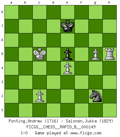 Last move : 1-0 2010 July 4 20:24:0 [Event "FICGS__CHESS__RAPID_B__000149"] [Site "FICGS"] [Date "2010.04.22"] [Round "1"] [White "Ponting,Andrew"] [Black "Salonen,Jukka"] [Result "1-0"] [WhiteElo "1716"] [BlackElo "1829"] 1.e4 c5 2.Nf3 d6 3.d4 cxd4 4.Nxd4 Nf6 5.Nc3 g6 6.Be3 Bg7 7.f3 O-O 8.Qd2 Nc6 9.Bc4 Ne5 10.Bb3 Bd7 11.O-O-O Rc8 12.Kb1 Rc5 13.Ne6 fxe6 14.Bxc5 dxc5 15.Bxe6+ Bxe6 16.Qxd8 Rxd8 17.Rxd8+ Kf7 18.Rb8 b6 19.Rb7 Nc6 20.Nb5 Ne8 21.Nxa7 Nd6 22.Rc7 Nxa7 23.Rxa7 Nc4 24.b3 Ne3 25.g4 b5 26.h4 h6 27.a4 bxa4 28.bxa4 Nc4 29.a5 Bc3 30.a6 Be5 31.g5 h5 32.Ra8 Nb6 33.Rd8 Bc7 34.Rhd1 Bxd8 35.Rxd8 Nc8 36.Kb2 Bh3 37.Kb3 e5 38.Kc3 Be6 39.Rd1 Ke7 40.Ra1 Na7 41.Rb1 Bc8 42.Rb6 Bxa6 43.Rxa6 Nb5+ 44.Kc4 Nd4 45.Rxg6 Nxf3 46.Rh6 Nxh4 47.Rxh5 Ng2 48.Kxc5 1-0 Sicilian : Dragon, Yugoslav attack, 7...O-O Kingside Castling by player Black (move 7) Queenside Castling by player White (move 11) 10 pieces endgame at move 46 : White KRPPP , Black KNPPP WHITE : King + 1 Rook 3 Pawns BLACK : King + 1 Knight 3 Pawns 9 pieces endgame at move 47 : White KRPPP , Black KNPP WHITE : King + 1 Rook 3 Pawns BLACK : King + 1 Knight 2 Pawns 8 pieces endgame at move 48 : White KRPPP , Black KNP WHITE : King + 1 Rook 3 Pawns BLACK : King + 1 Knight 1 Pawn Player White won this chess game. Follow this game move after move (download)The older I grow, the more I value pawns. (Paul Keres) Rauchen ist dem Schachspieler bei seiner Arbeit, also im Wettkampf, untersagt. (Viktor Kortschnoi) La última cosa en que Fischer estaba interesado era en tonterías, siempre y cuando el Ajedrez estuviera involucrado. (Elie Agur) Un millionnaire : 'Monsieur Steinitz ! Vous ne participez aux tournois que pour l'argent, alors que moi je n'y viens que pour l'honneur.' Steinitz : 'Chacun joue pour ce qu'il n'a pas'... Convictions are more dangerous enemies of truth than lies. (Friedrich Nietzsche)