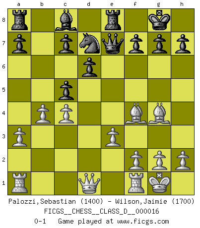 Last move : 0-1 2006 December 1 17:28:57 [Event "FICGS__CHESS__CLASS_D__000016"] [Site "FICGS"] [Date "2006.10.30"] [Round "1"] [White "Palozzi,Sebastian"] [Black "Wilson,Jaimie"] [Result "0-1"] [WhiteElo "1400"] [BlackElo "1700"] 1.d4 Nf6 2.c4 e5 3.dxe5 Ng4 4.Bf4 Nc6 5.Nf3 Bb4+ 6.Nbd2 Qe7 7.e3 Ngxe5 8.Nxe5 Nxe5 9.Be2 d6 10.O-O O-O 11.Nb3 b6 12.a3 Bc5 13.Nxc5 bxc5 14.b4 Nd7 15.Bg4 Re8 0-1 Budapest : Rubinstein variation Kingside Castling by player White (move 10) Kingside Castling by player Black (move 10) Player Black won this chess game. Follow this game move after move (download)Robert Fischer is a law unto himself. (Larry Evans) Ich suche im Schach immer etwas Eigenes. Riskantes Spiel im Stile schachlicher Musketiere ist nicht meine Sache, auch wenn es vielen Freunden scharfer Wendungen gefällt. (Anatoly Karpov) Un buen sacrificio es aquel que aunque no sea necesariamente sólido, deja a tu oponente aturdido y confuso. (Rudolph Spielmann) Karpov est une pièce de musée. (Garry Kasparov) Remember : Your focus determines your reality. (Qui-Gon Jinn in Star Wars ep.1)