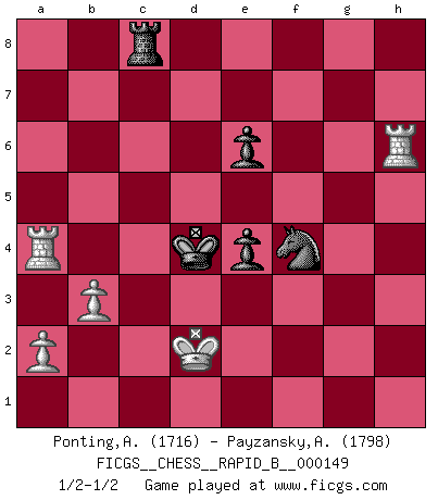 Last move : 1/2-1/2 2010 May 28 18:58:48 [Event "FICGS__CHESS__RAPID_B__000149"] [Site "FICGS"] [Date "2010.04.22"] [Round "1"] [White "Ponting,Andrew"] [Black "Payzansky,Aleksey"] [Result "1/2-1/2"] [WhiteElo "1716"] [BlackElo "1798"] 1.e4 c5 2.Nf3 d6 3.d4 cxd4 4.Nxd4 Nf6 5.Nc3 g6 6.Be3 Bg7 7.f3 O-O 8.Qd2 Nc6 9.Bc4 Bd7 10.O-O-O Rc8 11.Bb3 Ne5 12.Kb1 a6 13.h4 h5 14.g4 hxg4 15.h5 Nxh5 16.Rdg1 Qa5 17.Bh6 Bf6 18.fxg4 Bxg4 19.Bf4 Nc4 20.Bxc4 Rxc4 21.Nb3 Bxc3 22.Nxa5 Bxd2 23.Nxc4 Bxf4 24.Rxg4 Ng3 25.Rh3 Ne2 26.c3 b5 27.Ne3 Be5 28.Rf3 e6 29.Kc2 b4 30.Rf2 Ng3 31.Nc4 Nh5 32.Nxe5 dxe5 33.Rg5 bxc3 34.b3 f6 35.Rxg6+ Kf7 36.Rg4 Nf4 37.Rh2 f5 38.Rh7+ Kf6 39.Rh6+ Ke7 40.exf5 Rxf5 41.Kxc3 Rf8 42.Rg7+ Kd6 43.Ra7 Rc8+ 44.Kd2 e4 45.Rxa6+ Ke5 46.Ra5+ Kd4 47.Ra4+ 1/2-1/2 Sicilian : Dragon, Yugoslav attack, 7...O-O Kingside Castling by player Black (move 7) Queenside Castling by player White (move 10) 10 pieces endgame at move 45 : White KRRPP , Black KRNPP WHITE : King + 2 Rooks 2 Pawns BLACK : King + 1 Rook 1 Knight 2 Pawns This chess game ended in a draw. Follow this game move after move (download)Chess is like war on a board. (Bobby Fischer) Du kannst im Schach nur gut werden, wenn du das Spiel liebst. (Robert James Fischer) No solamente yo pronostico su triunfo sobre Botvinnik, sino que me adelanto y digo que probablemente Fischer es el jugador de Ajedrez mas grande que haya existido. (John Collins) Le plus grand jeu de l'esprit jamais inventé, plus vous l'apprenez, plus vous y prenez du plaisir. (Garry Kasparov) If you ain't just a little scared when you enter a casino, you are either very rich or you haven't studied the games enough. (Pappy)