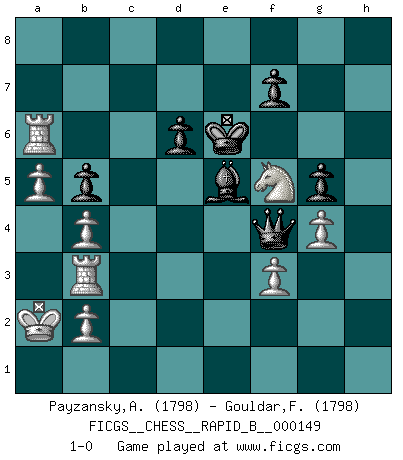 Last move : 1-0 2010 May 31 18:12:54 [Event "FICGS__CHESS__RAPID_B__000149"] [Site "FICGS"] [Date "2010.04.22"] [Round "1"] [White "Payzansky,Aleksey"] [Black "Gouldar,Frances"] [Result "1-0"] [WhiteElo "1798"] [BlackElo "1798"] 1.e4 c5 2.Nf3 d6 3.d4 cxd4 4.Nxd4 Nf6 5.Nc3 g6 6.Be3 Bg7 7.f3 O-O 8.Qd2 Nc6 9.Bc4 Nxd4 10.Bxd4 Qa5 11.O-O-O Be6 12.Bb3 Bxb3 13.cxb3 Rfc8 14.Kb1 Rc7 15.g4 Rac8 16.Bxf6 Bxf6 17.Nd5 Rc1+ 18.Qxc1 Rxc1+ 19.Rxc1 Kg7 20.Rhd1 Qb5 21.Rc4 g5 22.h3 a6 23.Rd3 h6 24.a4 Qa5 25.Rc1 Kg6 26.R3d1 Qd8 27.e5 Bxe5 28.Rc8 Qa5 29.Nxe7+ Kh7 30.Nd5 Kg6 31.Rc2 b5 32.b4 Qd8 33.a5 Qa8 34.Rc7 h5 35.Ne7+ Kg7 36.Rd3 hxg4 37.Nf5+ Kf6 38.hxg4 Ke6 39.Ka2 Qh8 40.Rc6 Qh2 41.Rb3 Qf4 42.Rxa6 1-0 Sicilian : Dragon, Yugoslav attack, 7...O-O Kingside Castling by player Black (move 7) Queenside Castling by player White (move 11) Player White won this chess game. Follow this game move after move (download)Fischer wanted to give the Russians a taste of their own medicine. (Larry Evans) Wenn du gegen Bobby spielst, ist es keine Frage von gewinnen oder verlieren. Es ist eine Frage des Überlebens. (Boris Vassilievich Spassky) Estaba muy claro de que el punto vulnerable del Gran Maestro Americano (Bobby Fischer) radicaba en las posiciones de doble filo, colgantes, irracionales, donde el siempre falló en encontrar un triunfo aún en una posición de clara victoria. (Efim Geller) L'attaque fait le spectacle, la défense gagne les matchs. (Dicton footballistique) Gambling is the son of avarice and the father of despair. (French proverb)