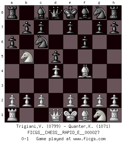 Last move : 0-1 2010 June 1 8:52:23 [Event "FICGS__CHESS__RAPID_E__000027"] [Site "FICGS"] [Date "2010.04.22"] [Round "1"] [White "Trigiani,Vincenzo"] [Black "Quanter,Kirsty"] [Result "0-1"] [WhiteElo "0799"] [BlackElo "1071"] 1.d4 d5 2.Bf4 Nc6 3.Nc3 f6 4.Nb5 a6 0-1 This chess game has been lost on time (started : 2010.04.22 20:55:47) Queen's pawn, Mason variation Player Black won this chess game. Follow this game move after move (download)Chess is a forcing house where the fruits of character can ripen more fully than in life. (Edward Morgan Foster) Besser ein falscher Plan, logisch durchgeführt, als gar kein Plan. (Viktor Kortschnoi) Es muy difícil jugar en contra de la teoría de Einstein. - en su primera derrota en contra de Fischer (Mikhail Tal) Avant la finale, les dieux ont créé le milieu de partie. (Tarrasch) You lose, general Kenobi. (General Grievous in Star Wars ep.3)