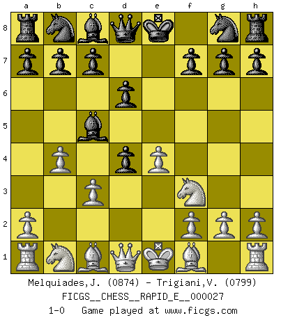 Last move : 1-0 2010 May 30 20:48:29 [Event "FICGS__CHESS__RAPID_E__000027"] [Site "FICGS"] [Date "2010.04.22"] [Round "1"] [White "Melquiades,Jay"] [Black "Trigiani,Vincenzo"] [Result "1-0"] [WhiteElo "0874"] [BlackElo "0799"] 1.e4 e5 2.Nf3 Bc5 3.d4 exd4 4.c3 d6 5.b4 1-0 This chess game has been lost on time (started : 2010.04.22 20:55:47) King's knight Opening Player White won this chess game. Follow this game move after move (download)Strategy requires thought, tactics require observation. (Max Euwe) Es liegt in der Natur, vernüftig zu denken und unlogisch zu handeln. (Anatole France) Un buen sacrificio es aquel que aunque no sea necesariamente sólido, deja a tu oponente aturdido y confuso. (Rudolph Spielmann) La tactique est l'élément le plus important du milieu de jeu. (Siegbert Tarrasch) No, I am still playing. (Anatoly Karpov)