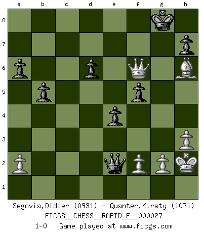 Last move : 1-0 2010 June 17 11:59:29 [Event "FICGS__CHESS__RAPID_E__000027"] [Site "FICGS"] [Date "2010.04.22"] [Round "1"] [White "Segovia,Didier"] [Black "Quanter,Kirsty"] [Result "1-0"] [WhiteElo "0931"] [BlackElo "1071"] 1.e4 e5 2.Nf3 Nc6 3.Bb5 Nge7 4.c3 a6 5.Bxc6 Nxc6 6.O-O d6 7.d4 f5 8.d5 Na5 9.exf5 Bxf5 10.Nbd2 g6 11.b4 e4 12.Re1 Qe7 13.Nd4 c5 14.Nxf5 gxf5 15.Qa4+ b5 16.Qxa5 cxb4 17.Nf3 Bg7 18.Qxb4 Rc8 19.Bb2 O-O 20.Nd4 Rc4 21.Qa5 Bxd4 22.cxd4 Ra8 23.Qd2 Rac8 24.Rec1 Qf7 25.Qg5+ Kh8 26.Qf4 Qxd5 27.Qg5 Rxc1+ 28.Rxc1 Rxc1+ 29.Bxc1 Qxd4 30.h3 Qd1+ 31.Kh2 Qe2 32.Qf6+ Kg8 33.Bh6 1-0 Ruy Lopez : Cozio defense Kingside Castling by player White (move 6) Kingside Castling by player Black (move 19) Player White won this chess game. Follow this game move after move (download)Fischer was a master of clarity and a king of artful positioning. His opponents would see where he was going but were powerless to stop him. (Bruce Pandolfini) Jeder Fehler erscheint unglaublich dumm, wenn andre ihn begehen. (Georg Christoph Lichtenberg) Tu eres para mi la Reina en d8 y yo soy el Peón en d7!!. (GM Eduard Gufeld) Toutes choses étant égales, c'est la conviction qui gagne. Alliée à une volonté de vaincre, elle sert de détonateur, suscite des idées, disperse les doutes et aide à penser clairement. (Robert Fischer) Internet: Absolute communication, absolute isolation. (Paul Carvel)