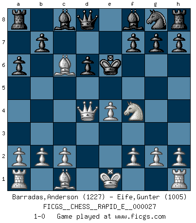 Last move : 1-0 2010 June 6 21:15:14 [Event "FICGS__CHESS__RAPID_E__000027"] [Site "FICGS"] [Date "2010.04.22"] [Round "1"] [White "Barradas,Anderson"] [Black "Eife,Gunter"] [Result "1-0"] [WhiteElo "1227"] [BlackElo "1005"] 1.e4 c5 2.Nf3 d6 3.d4 cxd4 4.Nxd4 e5 5.Nc3 exd4 6.Qxd4 Nc6 7.Bb5 a6 8.Bxc6+ Ke7 9.Nd5+ Ke6 10.Nf4+ Ke7 11.Nd5+ Ke6 12.Nf4+ 1-0 This chess game has been lost on time (started : 2010.04.22 20:55:47) Sicilian Player White won this chess game. Follow this game move after move (download)It was clear to me that the vulnerable point of the American Grandmaster (Bobby Fischer) was in double-edged, hanging, irrational positions, where he often failed to find a win even in a won position. (Efim Geller) Wenn du auf das Glück wartest, wird das Leben ziemlich langweilig. (Mikhail Nekhemyevich Tal) El Ajedrez expande y enriquece tu mente. (Saudin Robovic) Les écrivains ont utilisé les échecs pour analyser les côtés extrêmes de la nature humaine. Dans ce cadre, les échecs offrent un champ d'expérimentation idéal. Mais on pourrait faire la même chose avec la peinture. Et là, en vous référant à Van Gogh, vous ne tirerez pas de conclusion définitive sur les peintres. (Gary Kasparov) Horse racing is animated roulette. (Roger Kahn)