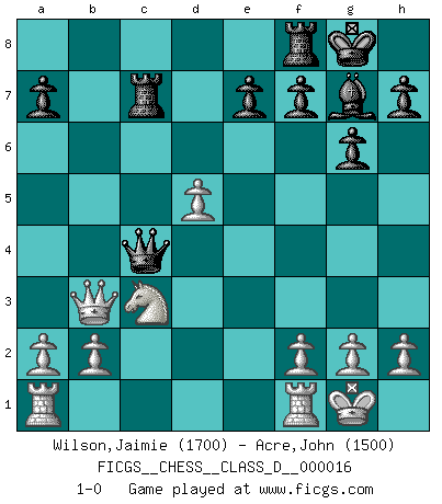 Last move : 1-0 2007 January 27 7:28:27 [Event "FICGS__CHESS__CLASS_D__000016"] [Site "FICGS"] [Date "2006.10.30"] [Round "1"] [White "Wilson,Jaimie"] [Black "Acre,John"] [Result "1-0"] [WhiteElo "1700"] [BlackElo "1500"] 1.d4 Nf6 2.Nf3 g6 3.c4 Bg7 4.Nc3 O-O 5.Bg5 c5 6.e3 cxd4 7.exd4 d5 8.Bxf6 Bxf6 9.Nxd5 Bg7 10.Nc3 Bg4 11.Be2 Nc6 12.d5 Bxf3 13.Bxf3 Ne5 14.Be2 Rc8 15.Qb3 Qc7 16.O-O Nxc4 17.Bxc4 Qxc4 18.Qxb7 Rc7 19.Qb3 1-0 King's Indian : East Indian defense Kingside Castling by player Black (move 4) Kingside Castling by player White (move 16) Player White won this chess game. Follow this game move after move (download)Chess holds its master in its own bonds, shackling the mind and brain so that the inner freedom of the very strongest must suffer. (Albert Einstein) Wie kann ich Remis annehmen? Ich weiß ja gar nicht, wie ich stehe! (Fritz Sämisch) Debemos de asegurarnos de que el Ajedrez no se convierta en un lenguaje muerto, muy interesante, pero solo para un grupo muy pequeño. (Sytze Faber) Le joueur d'Echecs qui veut atteindre le top est obligé de développer son propre credo créatif. Alexeï Stepanovicth Souétine. Il est facile d'écrire des livres ! Ce qui est difficile, c'est de jouer ! (Alexeï Stepanovicth Souétine) Experiences are the keys to life. (Daniel Parmet)