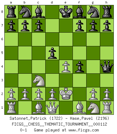 Last move : 0-1 2010 June 6 21:15:14 [Event "FICGS__CHESS__THEMATIC_TOURNAMENT__000112"] [Site "FICGS"] [Date "2010.04.22"] [Round "1"] [White "Satonnet,Patrick"] [Black "Hase,Pavel"] [Result "0-1"] [WhiteElo "1722"] [BlackElo "2196"] 1.e4 e5 2.f4 exf4 3.Nc3 Qh4+ 4.Ke2 d5 0-1 This chess game has been lost on time (started : 2010.04.22 23:59:12) KGA : Keres (Mason-Steinitz) gambit Player Black won this chess game. Follow this game move after move (download)A sacrifice is best refuted by accepting it. (Wilhelm Steinitz) Wenn Dein Gegner dir ein Remis anbietet, versuch herauszufinden, weshalb er glaubt schlechter zu stehen. (Nigel Short) Los errores estan ahí, esperando a que se cometan. (Savielly Tartakower) Le temps de noter son nom sur la feuille de partie, j'étais déjà en zeitnot ! D'un modeste amateur apparié lors de la première ronde d'un open contre le grand-maître Azmaïparashvili. Mandala - that's it! 16x16 squares as multiple of the four and the eight because of the Four Noble Truths and the Noble Eightfold Path. (Heinz-Georg Lehnhoff about Big Chess)