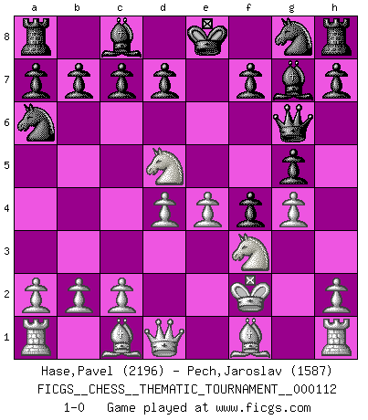 Last move : 1-0 2010 June 19 1:20:38 [Event "FICGS__CHESS__THEMATIC_TOURNAMENT__000112"] [Site "FICGS"] [Date "2010.04.22"] [Round "1"] [White "Hase,Pavel"] [Black "Pech,Jaroslav"] [Result "1-0"] [WhiteElo "2196"] [BlackElo "1587"] 1.e4 e5 2.f4 exf4 3.Nc3 Qh4+ 4.Ke2 g5 5.Nf3 Qh5 6.d4 Bg7 7.Nd5 Na6 8.g4 Qg6 9.Kf2 1-0 This chess game has been lost on time (started : 2010.04.22 23:59:12) KGA : Keres (Mason-Steinitz) gambit Player White won this chess game. Follow this game move after move (download)When I have White, I win because I am white; When I have Black, I win because I am Bogolyubov. (Bogolyubov) Die westlichen Werte sind eine Sprache, welche die Putin-Administration nicht versteht. (Garry Kasparov) Sin errores no puede haber brillantez. (Emanuel Lasker) Vouloir jouer aux échecs contre soi-même est aussi paradoxal que vouloir marcher sur son ombre. (Stefan Zweig) Indecision is the key to flexibility. (Unknown)