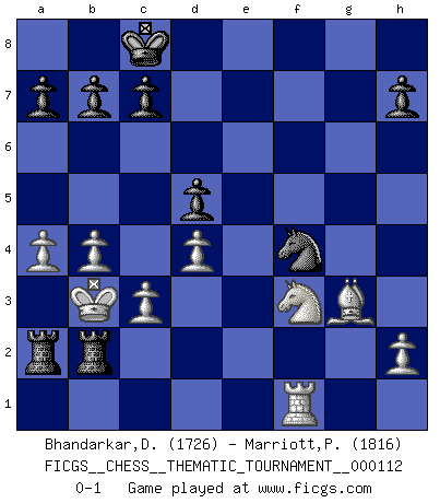 Last move : 0-1 2010 June 6 19:30:14 [Event "FICGS__CHESS__THEMATIC_TOURNAMENT__000112"] [Site "FICGS"] [Date "2010.04.22"] [Round "1"] [White "Bhandarkar,Dinesh"] [Black "Marriott,Peter"] [Result "0-1"] [WhiteElo "1726"] [BlackElo "1816"] 1.e4 e5 2.f4 exf4 3.Nc3 Qh4+ 4.Ke2 g5 5.Nf3 Qh5 6.d4 Ne7 7.Kf2 d6 8.Be2 g4 9.Ne1 Qh4+ 10.Kg1 f3 11.gxf3 gxf3 12.Bxf3 Rg8+ 13.Kf1 Bh3+ 14.Ke2 Nbc6 15.Be3 O-O-O 16.Qd2 f5 17.Kd1 Re8 18.Kc1 fxe4 19.Nxe4 Nf5 20.Bf2 Qh6 21.c3 Bg4 22.Qxh6 Bxh6+ 23.Nd2 Bxd2+ 24.Kxd2 Bxf3 25.Nxf3 Rg2 26.Raf1 Ne3 27.Kd3 Nxf1 28.Rxf1 Ne7 29.a4 Nd5 30.b4 Nf4+ 31.Kc4 d5+ 32.Kb3 Re2 33.Bg3 Rb2+ 34.Ka3 Ra2+ 35.Kb3 Rgb2+ 0-1 KGA : Keres (Mason-Steinitz) gambit Queenside Castling by player Black (move 15) Player Black won this chess game. Follow this game move after move (download)The defensive power of a pinned piece is only imaginary. (Aaron Nimzovich) Ich bin Weltmeister und muß mit niemandem irgend etwas diskutieren. (Viswanathan Anand) Te sientas frente a un tablero y repentinamente tu corazón brinca. Tu mano tiembla al tomar una pieza y moverla. Pero lo que el Ajedrez te enseña es que tu debes permanecer ahí con calma y pensar de que si realmente es una buena idea o de que si hay otras ideas mejores. (Stanley Kubrick) Ce n'est pas pour s'amuser qu'il joue aux échecs : il célèbre un culte. (Vladimir Nabokov) Life is like internet, nothing interesting, but noone want to leave it. (Ilmars Cirulis)