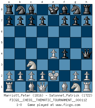 Last move : 1-0 2010 June 6 21:15:14 [Event "FICGS__CHESS__THEMATIC_TOURNAMENT__000112"] [Site "FICGS"] [Date "2010.04.22"] [Round "1"] [White "Marriott,Peter"] [Black "Satonnet,Patrick"] [Result "1-0"] [WhiteElo "1816"] [BlackElo "1722"] 1.e4 e5 2.f4 exf4 3.Nc3 Qh4+ 4.Ke2 1-0 This chess game has been lost on time (started : 2010.04.22 23:59:12) KGA : Keres (Mason-Steinitz) gambit Player White won this chess game. Follow this game move after move (download)You may learn much more from a game you lose than from a game you win. You will have to lose hundreds of games before becoming a good player. (Jose Raul Capablanca) Offener Brief an US-Präsident Bush anlässlich der Verhaftung Bobby Fishers: Verhaften Sie mich. Stecken Sie mich in dieselbe Zelle wie Bobby Fisher und geben Sie uns ein Schachspiel mit. (Boris Vassilievich Spassky) Yo adoro todas la posiciones. Denme una partida posicional difícil, y la jugaré. Pero posiciones totalmente ganadas, no las tolero. (Hein Donner) Votre prénom est 'Tactique', votre deuxième prénom est 'Tactique' et votre nom est 'Tactique'. (Ken Smith) When I took office, only high energy physicists had ever heard of what is called the World Wide Web... Now even my cat has its own page. (Bill Clinton, 1996)
