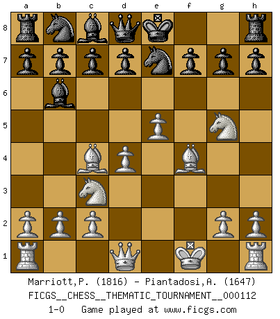 Last move : 1-0 2010 May 5 0:49:38 [Event "FICGS__CHESS__THEMATIC_TOURNAMENT__000112"] [Site "FICGS"] [Date "2010.04.22"] [Round "1"] [White "Marriott,Peter"] [Black "Piantadosi,Angelo"] [Result "1-0"] [WhiteElo "1816"] [BlackElo "1647"] 1.e4 e5 2.f4 exf4 3.Nc3 Nf6 4.e5 Ng8 5.Bc4 Qh4+ 6.Kf1 Bc5 7.d4 Bb6 8.Nf3 Qd8 9.Bxf4 Ne7 10.Ng5 1-0 KGA : Keres (Mason-Steinitz) gambit Player White won this chess game. Follow this game move after move (download)Robert Fischer is a law unto himself. (Larry Evans) Stil? Ich habe keinen Stil! (Anatoly Karpov) Buenas posiciones no logran ganar juegos, buenas movidas sí. (Gerald Abrahams) Un millionnaire : 'Monsieur Steinitz ! Vous ne participez aux tournois que pour l'argent, alors que moi je n'y viens que pour l'honneur.' Steinitz : 'Chacun joue pour ce qu'il n'a pas'... Luck never made a man wise. (Seneca, Letters to Lucilius)