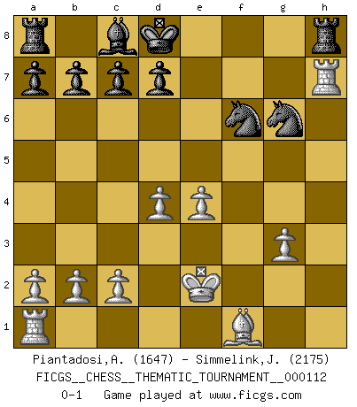 Last move : 0-1 2010 May 13 3:0:31 [Event "FICGS__CHESS__THEMATIC_TOURNAMENT__000112"] [Site "FICGS"] [Date "2010.04.22"] [Round "1"] [White "Piantadosi,Angelo"] [Black "Simmelink,Joop"] [Result "0-1"] [WhiteElo "1647"] [BlackElo "2175"] 1.e4 e5 2.f4 exf4 3.Nc3 Nc6 4.Nf3 g5 5.d4 g4 6.Ne5 Qh4+ 7.g3 fxg3 8.Qxg4 Nxe5 9.Qxh4 Nf3+ 10.Ke2 Nxh4 11.hxg3 Ng6 12.Nd5 Kd8 13.Bg5+ f6 14.Nxf6 Be7 15.Rxh7 Bxf6 16.Bxf6+ Nxf6 0-1 KGA : Keres (Mason-Steinitz) gambit Player Black won this chess game. Follow this game move after move (download)Every Chess master was once a beginner. (Chernev) Vielleicht wirkt die Aura früherer Spieler glanzvoller als die der heutigen Spieler, aber das liegt daran, dass man kein Programm wie Fritz hatte, das einem all die Löcher in ihren Partien zeigt. (Vladimir Kramnik) El Ajedrez es despiadado: debes de estar preparado para matar gente. (Nigel Short) Mais n'est-ce pas déjà le limiter injurieusement que d'appeler les échecs un jeu? N'est-ce pas aussi une science, un art, ou quelque chose qui, comme le cercueil de Mahomet entre ciel et terre, est suspendu entre l'un et l'autre, et qui réunit un nombre incroyable de contraires ? (Stefan Zweig) The bottom line is always the bottom line. (Johann Piek)