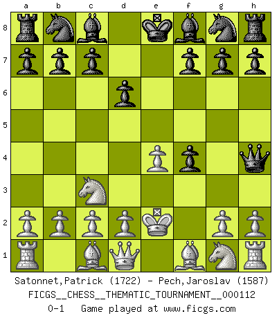 Last move : 0-1 2010 June 19 20:57:1 [Event "FICGS__CHESS__THEMATIC_TOURNAMENT__000112"] [Site "FICGS"] [Date "2010.04.22"] [Round "1"] [White "Satonnet,Patrick"] [Black "Pech,Jaroslav"] [Result "0-1"] [WhiteElo "1722"] [BlackElo "1587"] 1.e4 e5 2.f4 exf4 3.Nc3 Qh4+ 4.Ke2 d6 0-1 This chess game has been lost on time (started : 2010.04.22 23:59:12) KGA : Keres (Mason-Steinitz) gambit Player Black won this chess game. Follow this game move after move (download)Chess is the art of analysis. (Mikhail Botvinnik) Frage des Reporters: -Welche besonderen Umstände rechtfertigen das Anhalten der Uhren während einer Turnierpartie? Antwort: -Einen Fotographen zu strangulieren. (Siegbert Tarrasch) Después de la respuesta de las negras a 1.e4 con 1..e5, se quedan siempre tratando de entrar dentro del juego. (Howard Staunton) La guerre est enfant de la passion, la passion est enfant du narcissisme et le narcissisme est l'enfant. (...) Une autre partie ? (Thibault de Vassal) It's unlucky to be superstitious. (Dave Enteles)