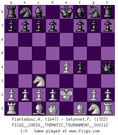 Last move : 1-0 2010 June 4 21:0:14 [Event "FICGS__CHESS__THEMATIC_TOURNAMENT__000112"] [Site "FICGS"] [Date "2010.04.22"] [Round "1"] [White "Piantadosi,Angelo"] [Black "Satonnet,Patrick"] [Result "1-0"] [WhiteElo "1647"] [BlackElo "1722"] 1.e4 e5 2.f4 exf4 3.Nc3 Qh4+ 4.Ke2 1-0 This chess game has been lost on time (started : 2010.04.22 23:59:12) KGA : Keres (Mason-Steinitz) gambit Player White won this chess game. Follow this game move after move (download)Chess is a foolish expedient for making idle people believe they are doing something very clever when they are only wasting their time. (George Bernard Shaw) Versuche, dich von der Sklaverei der Eröffnungsvarianten zu befreien. Stattdessen soll man gewisse Typenpositionen erlernen, die man eingehend analysiert. (Aaron Nimzowitsch) El Ajedrez es como la guerra en un tablero. (Bobby Fischer) Les réformistes prétendent que les progrès de la théorie conduiront à la disparition des échecs, et qu'il faut, pour leur rendre vie, en remanier les règles. En réalité, qu'exprime cette affirmation? Le mépris de l'intuition, de l'imagination et de tous les autres éléments qui font des échecs un art. (Alexander Alekhine) Nowadays, anyone who cannot speak English and is incapable of using the Internet is regarded as backward. (Al-Waleed bin Talal)
