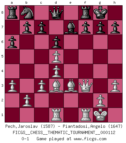 Last move : 0-1 2010 July 24 11:41:31 [Event "FICGS__CHESS__THEMATIC_TOURNAMENT__000112"] [Site "FICGS"] [Date "2010.04.22"] [Round "1"] [White "Pech,Jaroslav"] [Black "Piantadosi,Angelo"] [Result "0-1"] [WhiteElo "1587"] [BlackElo "1647"] 1.e4 e5 2.f4 exf4 3.Nc3 d6 4.Qf3 Nf6 5.Qxf4 Be7 6.Nf3 Nc6 7.a3 a6 8.d4 O-O 9.Bd3 Re8 10.O-O Nh5 11.Qe3 Bg4 12.h3 Bxf3 13.Qxf3 Nf6 14.Be3 Bf8 15.Nd5 Be7 16.c3 Rf8 17.Rad1 Nxd5 18.exd5 Nb8 0-1 KGA : Keres (Mason-Steinitz) gambit Kingside Castling by player Black (move 8) Kingside Castling by player White (move 10) Player Black won this chess game. Follow this game move after move (download)A thorough understanding of the typical mating continuations makes the most complicated sacrificial combinations leading up to them not only not difficult, but almost a matter of course. (Siegbert Tarrasch) Der Knackpunkt bei der Konzentration ist, daß wir nur durch sie etwas Neues und Ungewöhnliches am Schachbrett finden können. Sie ist der einzige Weg durch neue neue Ideen eine Überraschung zu bereiten. (Garry Kasparov) El Ajedrez te enseña a controlarl la excitación inicial que sientes cuando vez algo que parece bueno y te enseña a pensar objetivamente cuando te encuentras en problemas. (Stanley Kubrick) Seul un grand joueur sait à quel point il joue faiblement. (Xavier Tartacover) Never risk one's whole fortune unless supported by one's entire army. (Niccolo Machiavelli)