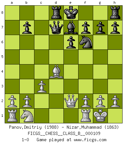 Last move : 1-0 2010 July 17 9:34:38 [Event "FICGS__CHESS__CLASS_B__000109"] [Site "FICGS"] [Date "2010.04.23"] [Round "1"] [White "Panov,Dmitriy"] [Black "Nizar,Muhammad"] [Result "1-0"] [WhiteElo "1988"] [BlackElo "1863"] 1.e4 c5 2.c3 d5 3.exd5 Qxd5 4.d4 Nc6 5.Nf3 Bg4 6.Be2 e6 7.O-O Nf6 8.Be3 cxd4 9.Nxd4 Bxe2 10.Qxe2 Rd8 11.Nb5 Qd7 12.Nxa7 Nxa7 13.Bxa7 Be7 14.Bd4 1-0 This chess game has been lost on time (started : 2010.04.23 23:23:48) Sicilian : Alapin's variation (2.c3) Kingside Castling by player White (move 7) Player White won this chess game. Follow this game move after move (download)After black's reply to 1.e4 with 1..e5, leaves him always trying to get into the game. (Howard Staunton) Spiel ein langweiliges Spiel zu Ende und lustige Dinge können passieren. (Hans Ree) Coloca el contenido de las piezas del Ajedrez en un sombrero, agitalo vigorosamente, arrojalas en un tablero desde una altura de 30 centimetros y así obtendras el estilo de Steinitz. (H. E. Bird) On entre au jeu d'Echecs comme on entre en Religion. Pour le joueur d'Echecs, la partie d'Echecs c'est l'office, la messe, le défilé du 1er Mai, le dépôt de gerbe au Monument aux Morts. C'est un drame sacré. (Michel Roos) Vladimir Ras-Putin is still alive... He is also a good actor, I saw him in the Lord of the Rings. (Rodolfo d'Ettorre)