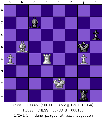 Last move : 1/2-1/2 2010 July 8 2:0:45 [Event "FICGS__CHESS__CLASS_B__000109"] [Site "FICGS"] [Date "2010.04.23"] [Round "1"] [White "Kirali,Hasan"] [Black "Konig,Paul"] [Result "1/2-1/2"] [WhiteElo "1861"] [BlackElo "1964"] 1.e4 c5 2.Nf3 Nc6 3.d4 cxd4 4.Nxd4 Nf6 5.Nc3 e6 6.Ndb5 d6 7.Bf4 e5 8.Bg5 a6 9.Na3 b5 10.Bxf6 gxf6 11.Nd5 Be6 12.c3 Bg7 13.Nc2 Ne7 14.Nce3 Bxd5 15.Nxd5 O-O 16.Be2 Nxd5 17.Qxd5 Qd7 18.O-O Rab8 19.Rad1 Rb6 20.Rd3 f5 21.exf5 Qxf5 22.Rfd1 Qc8 23.Qe4 f5 24.Qb4 Qc5 25.Qb3+ Kh8 26.Qe6 Qc4 27.Qxc4 bxc4 28.Rxd6 Rxb2 29.Bxc4 e4 30.Rxa6 Bxc3 31.Re6 Bb4 32.Re5 Kg7 33.g3 Kg6 34.Bb3 Bd2 35.Rb5 Kg7 36.a4 f4 37.Bc4 Rc2 38.Rb7+ Kh6 39.Bb5 Ra2 40.Re7 e3 41.fxe3 fxe3 42.Rf1 Rxf1+ 43.Kxf1 Bb4 44.Rxe3 Rxh2 45.Be2 Rh1+ 46.Kg2 Ra1 47.Bb5 Kg5 48.Bd7 Bd6 49.Rd3 Bc7 50.Rd5+ Kf6 51.g4 h6 52.Kf3 Rf1+ 53.Ke2 Rc1 54.Bb5 Rg1 55.Rd4 Kg5 1/2-1/2 Sicilian defense Kingside Castling by player Black (move 15) Kingside Castling by player White (move 18) 10 pieces endgame at move 44 : White KRBPPP , Black KRBP WHITE : King + 1 Rook 1 Bishop 3 Pawns BLACK : King + 1 Rook 1 Bishop 1 Pawn 9 pieces endgame at move 44 : White KRBPP , Black KRBP WHITE : King + 1 Rook 1 Bishop 2 Pawns BLACK : King + 1 Rook 1 Bishop 1 Pawn This chess game ended in a draw. Follow this game move after move (download)Fischer Chess play was always razor-sharp, rational and brilliant. One of the best ever. (Dave Regis) Es ist im Leben wie im Schachspiel. Wir entwerfen einen Plan, dieser bleibt jedoch bedingt durch das, was im Schachspiel dem Gegner, im Leben dem Schicksal zu tun belieben wird. (Arthur Schopenhauer) Tu sabes, camarada Pachman, no disfruto el ser un Ministro, preferería jugar al Ajedrez como tu. (Che Guevara) Avec des compensations pour le matériel en plus... (Anonyme) The intuitive mind is a sacred gift; the rational mind is a faithful servant. We have created a society that honors the servant but has forgotten the gift. (Albert Einstein)