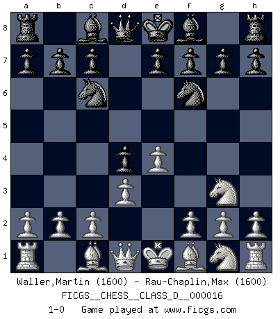 Last move : 1-0 2006 December 11 17:56:21 [Event "FICGS__CHESS__CLASS_D__000016"] [Site "FICGS"] [Date "2006.10.30"] [Round "1"] [White "Waller,Martin"] [Black "Rau-Chaplin,Max"] [Result "1-0"] [WhiteElo "1600"] [BlackElo "1600"] 1.e4 d5 2.Nc3 d4 3.Nce2 Nc6 4.Ng3 Nf6 5.d3 1-0 This chess game has been lost on time (started : 2006.10.30 12:5:37) Scandinavian (centre counter) defense Player White won this chess game. Follow this game move after move (download)Avoid the crowd. Do your own thinking independently. Be the Chess player, not the Chess piece. (Ralph Charell) Eine Person mit durchschnittlichem IQ kann etwa eine ELO von 2000 erreichen. (Jonathan Levitt) Un sacrificio se refuta mucho mejor al aceptarlo. (Wilhelm Steinitz) Le plus grand jeu de l'esprit jamais inventé, plus vous l'apprenez, plus vous y prenez du plaisir. (Garry Kasparov) Shallow men believe in luck. Strong men belive in cause and effect. (Ralph Waldo Emerson)