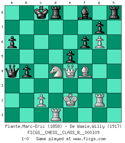 Last move : 1-0 2010 August 13 18:33:24 [Event "FICGS__CHESS__CLASS_B__000109"] [Site "FICGS"] [Date "2010.04.23"] [Round "1"] [White "Plante,Marc-Eric"] [Black "De Waele,Willy"] [Result "1-0"] [WhiteElo "1858"] [BlackElo "1917"] 1.e4 c5 2.Nf3 d6 3.d4 cxd4 4.Nxd4 Nf6 5.Nc3 a6 6.Be3 e6 7.f3 b5 8.g4 h6 9.Qd2 b4 10.Nce2 Nbd7 11.O-O-O Qc7 12.h4 d5 13.Rg1 dxe4 14.g5 hxg5 15.hxg5 exf3 16.Nxf3 Ne4 17.Qd4 Bb7 18.Bf4 Qd8 19.Bg2 Ndc5 20.g6 f6 21.Qe3 Qa5 22.Nd2 Qxa2 23.Nxe4 Qa1+ 24.Kd2 O-O-O 25.Nd4 Qxb2 26.Ke2 e5 27.Nxc5 Bxg2 28.Na4 Qa2 29.Rxg2 Qxa4 30.Qe4 1-0 Sicilian : Najdorf, Byrne (English) attack Queenside Castling by player White (move 11) Queenside Castling by player Black (move 24) Player White won this chess game. Follow this game move after move (download)Adequate compensation for a sacrifice is having a sound combination leading to a winning position; adequate compensation for a blunder is having your opponent snatch defeat from the jaws of victory. (Bruce A. Moon) Modernes Schach sorgt sich zuviel um Dinge wie Bauernstruktur usw. Vergessen Sie das, Schachmatt beendet das Spiel! (Nigel Short) Un jugador que es sorprendido, esta derrotado a medias. (Proverbio) Le joueur d'Echecs qui veut atteindre le top est obligé de développer son propre credo créatif. Alexeï Stepanovicth Souétine. Il est facile d'écrire des livres ! Ce qui est difficile, c'est de jouer ! (Alexeï Stepanovicth Souétine) When you've done things right people won't know you've done anything at all. (Futurama)