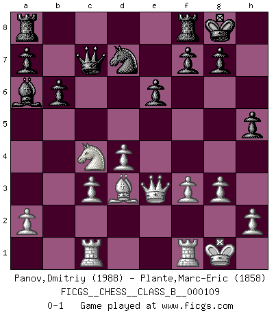 Last move : 0-1 2010 October 9 9:31:15 [Event "FICGS__CHESS__CLASS_B__000109"] [Site "FICGS"] [Date "2010.04.23"] [Round "1"] [White "Panov,Dmitriy"] [Black "Plante,Marc-Eric"] [Result "0-1"] [WhiteElo "1988"] [BlackElo "1858"] 1.e4 c5 2.c3 Nf6 3.e5 Nd5 4.d4 cxd4 5.cxd4 e6 6.Nf3 b6 7.Bd3 Bb7 8.O-O d6 9.Nc3 Nxc3 10.bxc3 Qc7 11.Bf4 Nd7 12.Rc1 dxe5 13.Bxe5 Bd6 14.Bxd6 Qxd6 15.Nd2 O-O 16.Nc4 Qf4 17.g3 Qc7 18.Qc2 h5 19.Qe2 Qc6 20.f3 Qc7 21.Qe3 Ba6 0-1 Sicilian : Alapin's variation (2.c3) Kingside Castling by player White (move 8) Kingside Castling by player Black (move 15) Player Black won this chess game. Follow this game move after move (download)For surely of all the drugs in the world, Chess must be the most permanently pleasurable. (Assiac) Die westlichen Werte sind eine Sprache, welche die Putin-Administration nicht versteht. (Garry Kasparov) El Ajedrez se juega con la mente... ¡no con las manos!. (Renaud y Kahn) Les erreurs sont comme les malheurs, elles n'arrivent jamais seules. (Siegbert Tarrasch) If you have any trouble condescending, find a Unix user to show you how it's done. (Scott Adams)