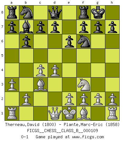 Last move : 0-1 2010 June 6 9:10:34 [Event "FICGS__CHESS__CLASS_B__000109"] [Site "FICGS"] [Date "2010.04.23"] [Round "1"] [White "Therneau,David"] [Black "Plante,Marc-Eric"] [Result "0-1"] [WhiteElo "1800"] [BlackElo "1858"] 1.c4 Nf6 2.d4 e6 3.Nc3 Bb4 4.Bd2 O-O 5.Nf3 b6 6.a3 Bxc3 7.Bxc3 Bb7 0-1 This chess game has been lost on time (started : 2010.04.23 23:23:48) English, 1...Nf6 (Anglo-Indian defense) Kingside Castling by player Black (move 4) Player Black won this chess game. Follow this game move after move (download)For me, Chess is life and every game is like a new life. Every Chess player gets to live many lives in one lifetime. (Eduard Gufeld) Spielt Blackmar-Diemer-Gambit, und das Matt kommt von selbst! (Emil Joseph Diemer) Cualquier cambio de material en una posición debe venir por medio de un mate, una captura o promoción de Peón. (Purdy) Les écrivains ont utilisé les échecs pour analyser les côtés extrêmes de la nature humaine. Dans ce cadre, les échecs offrent un champ d'expérimentation idéal. Mais on pourrait faire la même chose avec la peinture. Et là, en vous référant à Van Gogh, vous ne tirerez pas de conclusion définitive sur les peintres. (Gary Kasparov) Chess is everything: art, science and sport. (Anatoly Karpov)