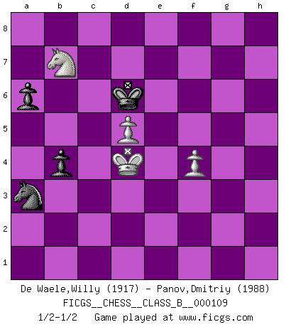 Last move : 1/2-1/2 2010 August 2 20:33:49 [Event "FICGS__CHESS__CLASS_B__000109"] [Site "FICGS"] [Date "2010.04.23"] [Round "1"] [White "De Waele,Willy"] [Black "Panov,Dmitriy"] [Result "1/2-1/2"] [WhiteElo "1917"] [BlackElo "1988"] 1.e4 e5 2.Nf3 Nf6 3.Nxe5 d6 4.Nf3 Nxe4 5.d4 d5 6.Bd3 Bd6 7.O-O O-O 8.c4 c6 9.Re1 Re8 10.Nc3 Nxc3 11.bxc3 dxc4 12.Bg5 Rxe1+ 13.Qxe1 Qf8 14.Bxc4 Nd7 15.Bd3 f6 16.Qe6+ Kh8 17.Qe4 g6 18.Bf4 Bxf4 19.Qxf4 Nb6 20.Re1 Nd5 21.Qh4 Kg7 22.c4 Nb4 23.Bb1 Bd7 24.Qf4 Na6 25.h4 Re8 26.Rxe8 Qxe8 27.h5 gxh5 28.Be4 Qe6 29.Nd2 Be8 30.Bf5 Qe7 31.Nf3 Qc7 32.Qe4 Bf7 33.Nh4 Bxc4 34.Bxh7 Bf7 35.Bg6 Nb4 36.g4 f5 37.Qxf5 hxg4 38.Qxg4 Bxg6 39.Qxg6+ Kh8 40.Nf5 Nd5 41.Kf1 b6 42.f3 Qd7 43.Nd6 Qg7 44.Qe8+ Qg8 45.Qxc6 Qe6 46.Qe8+ Qxe8 47.Nxe8 Nc3 48.Nd6 a6 49.a3 b5 50.Kf2 Nb1 51.Nb7 Kg7 52.d5 Kf7 53.Ke3 Nxa3 54.Na5 Ke7 55.Kd4 Kd6 56.f4 b4 57.Nb7+ 1/2-1/2 Petrov : Classical attack, Marshall variation Kingside Castling by player White (move 7) Kingside Castling by player Black (move 7) 10 pieces endgame at move 46 : White KNPPP , Black KQNPP WHITE : King + 1 Knight 3 Pawns BLACK : King + 1 Queen 1 Knight 2 Pawns 9 pieces endgame at move 47 : White KNPPP , Black KNPP WHITE : King + 1 Knight 3 Pawns BLACK : King + 1 Knight 2 Pawns 8 pieces endgame at move 53 : White KNPP , Black KNPP WHITE : King + 1 Knight 2 Pawns BLACK : King + 1 Knight 2 Pawns This chess game ended in a draw. Follow this game move after move (download)An attack on the wing should be met by play in the center. (Nimzovitch) Garry Kasparov war erst in der Großmeister-Organisation GMA, dann in der Profischach-Vereinigung PCA, zum Schluss kehrte er wieder in den Schoß der FIDE zurück. Aber gut, manche Leute sind flexibel (Viswanathan Anand) Muchos jugadores de Ajedrez se sorprendían cuando después de la partida, Fischer explicaba con calma: 'Yo ya había analizado esta posibilidad' en una posición en la cual yo creía que no era posible de prever desde la apertura. (Mikhail Tal) RxDa4 pat (...) The man who strikes first admits that his ideas have given out. (Chinese proverb)